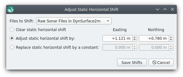 This dialog is used to clear, set or change the static horizontal shift that is to be applied to a selection of files. The Qimera Static Horizontal Shift Tool is expected to be the primary interface for setting horizontal shifts, but this tool is provided for those needing finer grained or more explicit control over their shifts.