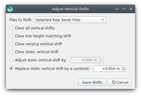 This dialog is used to clear, set or change the different types of vertical shifts that are applied to a selection of files. Qimera has 3 different vertical shifts that are combined to alter the Z position of the transducer which will then change the footprint positions. You can review the shifts applied to each file in the Processing Settings Dialog.