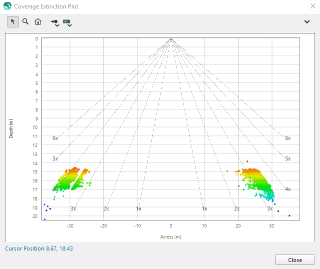 Data to fuel this type of plot usually consists of a set of survey lines running from the shallowest to deepest depth range of the system. As the depth increases, the outermost beams will experience increased difficulty with detection, and the coverage will continue to decrease until even nadir beams can no longer detect the bottom. Having this type of plot capability is very useful during Sea Acceptance Trials so the surveyor can assess the system's swath coverage performance relative to the manufacturer's claimed specifications to ensure compliance. It can also help call attention to sources of noise due to mechanical, acoustic or electrical sources of interference. Repeating these types of field trials before and after visits to ship yards can illuminate issues early on, considering mechanical and electrical changes are often made during dry dock periods. For instance, modifications to the hull made in dry dock can can create flow noise problems. Many examples of this type of plot being used to assess and diagnose system health can be seen in the technical reports produced by the Multibeam Advisory Committee (MAC) : http://mac.unols.org/reports.