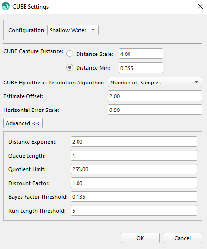 Internally, the CUBE algorithm has no concept of cells. A sounding may contribute to many different hypotheses depending on how far away the sounding is away from the hypothesis center in the XY plane. The Capture Distance option controls how far the sounding can be to contribute to a hypothesis and the algorithm assumes that deeper soundings will be less accurate. If the distance from the hypothesis center to the sounding is less than the sounding height multiplied by the Capture Distance percentage, the sounding will be included in the hypothesis. Smaller Capture Distance values result in less soundings contributing to a hypothesis and larger values result in more soundings contributing to a hypothesis. If the Capture Distance is too small, holes may appear in the data. In some cases, this Capture Distance does not make sense so to turn the algorithm off, enter 100 as the Capture Distance value.