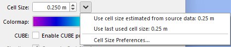 To set the cell size, you can use the spin box or select one of the options in the menu. Qimera can estimate the value with the "Use cell size estimated from source data" option, or you can set the cell size used to create the last grid with the "Use last used cell size" option.