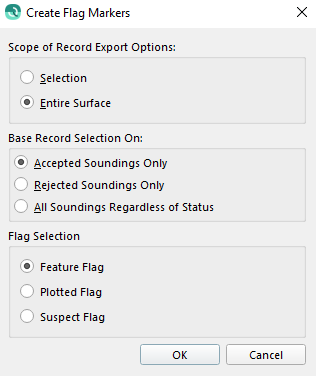 This object contains soundings marked with the Feature Flag, Plotted Flag, or the Suspect Flag, based of the selected criterion. If you have selected a rectangular area in the main window, the Selection option will only add soundings that fall within the selected area. You can further restrict the selection criteria based on the Accepted, Rejected, or all soundings.