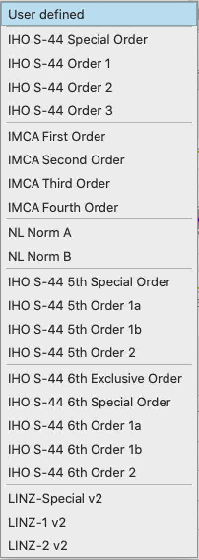 You can also select User defined and enter your own values for parameters A and B, these being the fixed and depth varying components of the standard IHO equation used to specify survey accuracy order. When you change either the custom values or the Order level, the statistics will be automatically recomputed and your plot will update accordingly. The results that you see in the tool will also be those that are used in the exported text files and/or report.