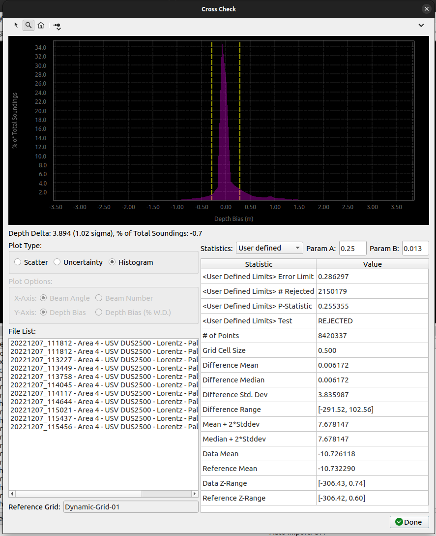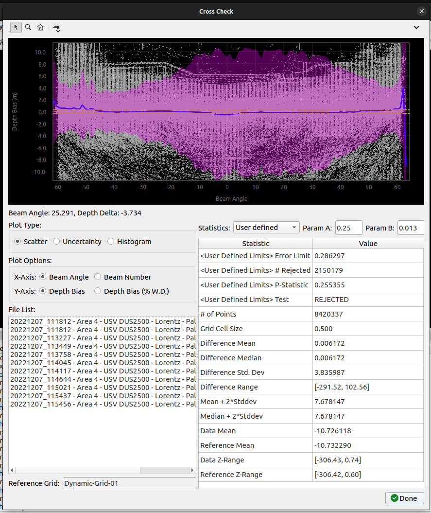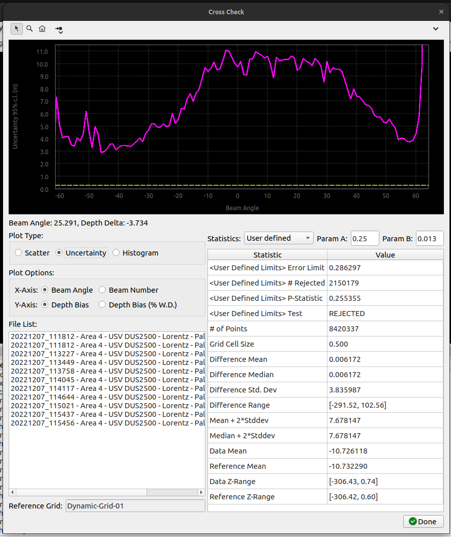 Cross Check performs a statistical analysis of beam footprint values referenced to a selected Dynamic or Static Grid.