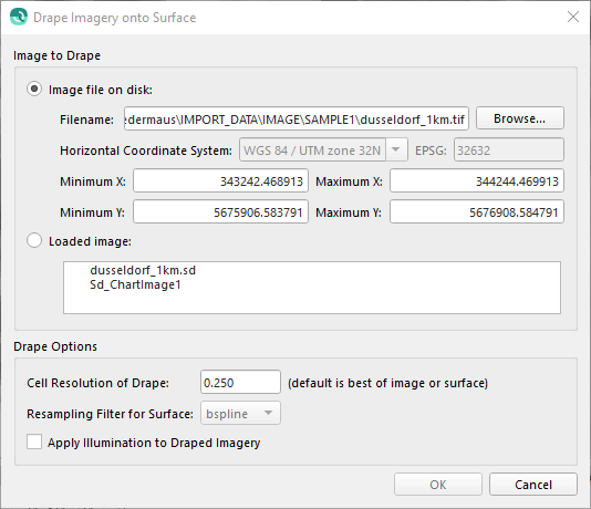 The dialog is divided into two main sections: an area to select an image and an area to set drape options. The first area, the image to drape area, is broken into two further options with a radio button for each option. Only one of the options may be chosen at a time, the first option loads an image from disk. The coordinate system and bounds may be specified or corrected in this area. The second option lists images that are already loaded in Qimera. Any image shown may be selected.