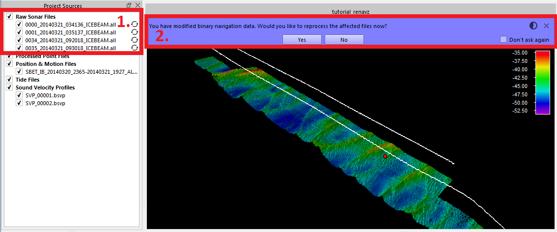 Qimera's Dynamic Workflow engine works by taking advantage of the dependencies between raw measurements, processed soundings and derivative products. If a raw measurement is altered, or a processing configuration is changed, the engine will establish which set of processed soundings must be updated. It will determine what type of re-processing must occur and which derivative products must be updated. While in manual workflow mode, Qimera will mark all source items that require reprocessing with an update icon :reprocess: in the Project Sources view panel (1). The user can also manually trigger an update by clicking the Auto Process button in the main toolbar.