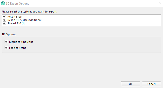 This option will export the selected sonar files to SD Cluster objects. Qimera will also pay attention to a spatial selection. You will see the same option dialog as you do when exporting SD Points. You have the option to specify which systems to export. You also have the option to merge all the lines into a single SD and an option to automatically load the SD object to the scene.