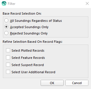 The Filter Setup button launches Filter Dialog. This dialog gives the options to export all soundings, only accepted soundings or only rejected soundings. Extra filters can be added to only export soundings that only have the flags Plotted, Feature, Suspect, or User Additional (water column picks) set.