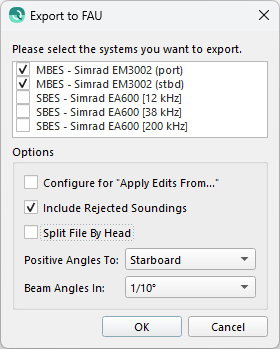 The next two options were enabled in Qimera release 1.7.6 as a result of multiple definitions in different FAU format description documents. They Default to the way Qimera exported to FAU for versions 1.7.5 and older (Positive Angles to Starboard and Beam Angles in 1/10 degree).