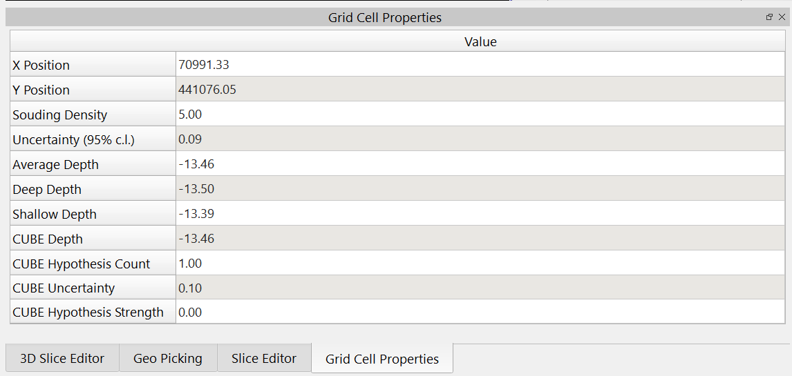 After selecting a dynamic surface from the layers window, Qimera will utilize this dock for viewing Cell information. The Cell Information will not just show cell information for the selected Dynamic Surface from the the layers window, but rather from any dynamic surface that the cursor is hovering over. Qimera will use the x,y position of the cursor and match that up with a Cell from the dynamic surface that the cursor is hovering over. The Grid Cell Properties Dock will display X, Y position of the cursor, the Sounding Density, the Uncertainty, and the Average, Deep and Shallow Depth values. If CUBE is included with the Dynamic Surface, it will also display the CUBE depth value, the number of hypothesis, the Hypothesis Uncertainty, and the Hypothesis Strength values.
