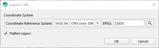 The coordinate reference system displays the coordinate system extracted from the DXF file. If this is not correct, change it via the "..." button and use the Coordinate System Selection dialog. This importer will create a Fledermaus SD model object and it will be added to the scene. It will appear under the SD Objects node of the Project Layers window.
