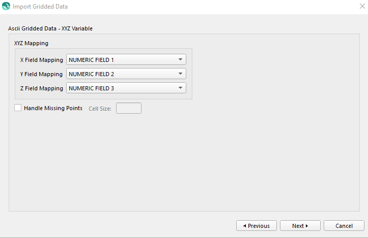 To check for missing data points in XYZ files check the Handle Missing Grid Points box. As Qimera scans the data it checks to make sure that each data point occurs. Any missing points are flagged as such in the output file. By default this option is not selected and it is assumed that the data file has all the required data points. To properly identify missing points, Qimera must be informed of the data cell size using the accompanying textfield.