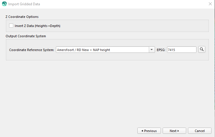 This page is used by all grid import types. This is the output coordinate system of the gridded data. Select your project coordinate system or Qimera will re-project the grid into the project coordinate system. See the section on Selecting Coordinate Systems for more information. You can also use this page to invert the Z values.