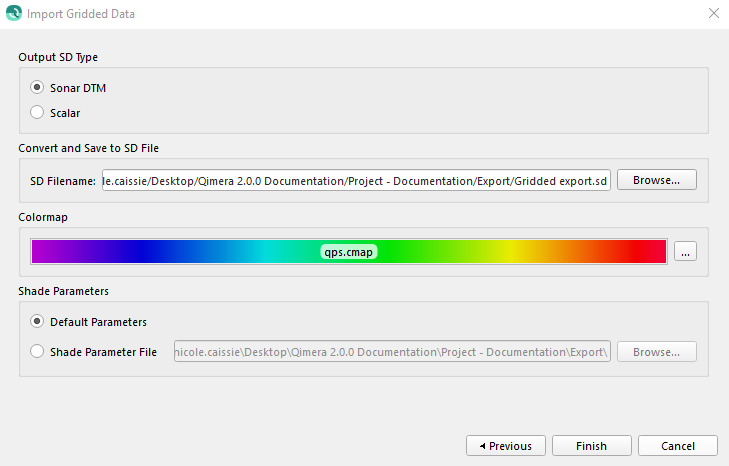 This page is used by all grid import types. You can select to product a Fledermaus DTM SD object or a Fledermaus Scalar SD object. You define the output filename as well as the default color map. When importing a Sonar DTM, you can also select the shading parameter options.