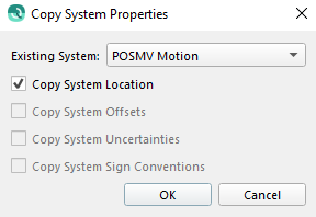 The set of properties that are allowable for copy will depend on the type of system you are creating and the type of system that you are copying from. For example, you cannot copy the angular offsets or uncertainties of an existing motion sensor to a newly created position system. Once you have chosen which properties you wish to copy, these values will be used to populate the appropriate fields in the New System dialog. You can edit these values after you have copied them.