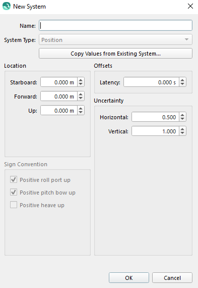 The New System dialog (shown below) allows you to specify a name, system type and available settings for the system type. If creating a new system for ASCII or Binary Navigation Import the System Type will be preconfigured.