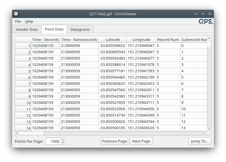 Instead of loading the entire file all at once, the points are loaded in pages, both to improve performance and to ease navigation. The number of Points Per Page can be adjusted via the spin box at the bottom of the tab. The Previous Page and Next Page buttons can be used to navigate forward and backward through the file. The Jump To... button allows jumping to a particular location in the file by specifying by the Record and Subrecord numbers. The exact meanings of record and subrecord vary between file formats, but typically a record number indicates a ping number and a subrecord number indicated a beam number within that ping.