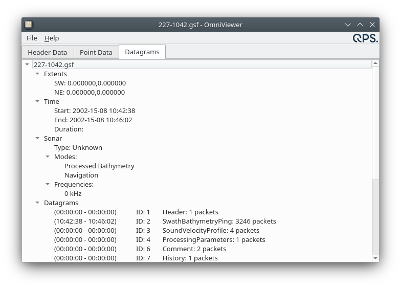 This tab displays a tree of metadata about the type of data and the various datagrams found in the file. Note that it does not display all the individual datagrams themselves. The exact contents will depend on the specific format, but the last section will show a summary of all the different datagram types found, including: the time range within which that datagram type appeared, the numeric ID of the datagram type, the textual name of the datagram type and the total number of occurrences.