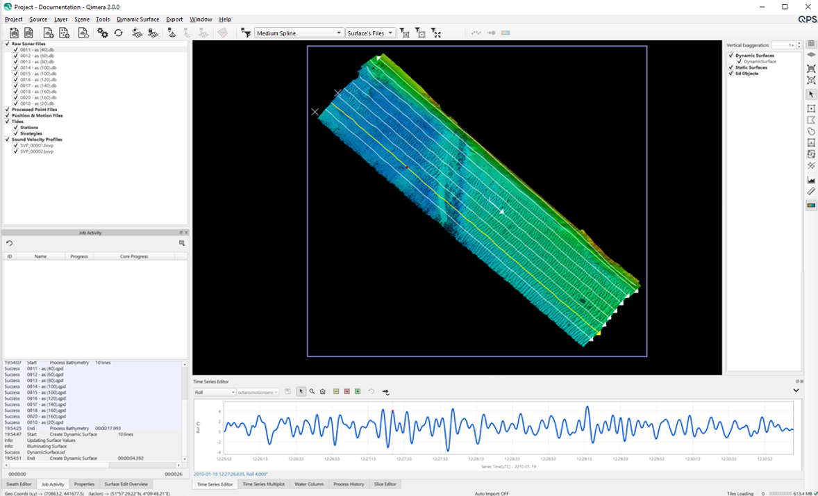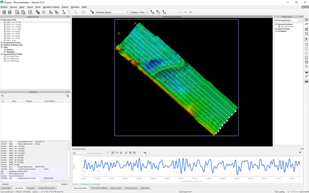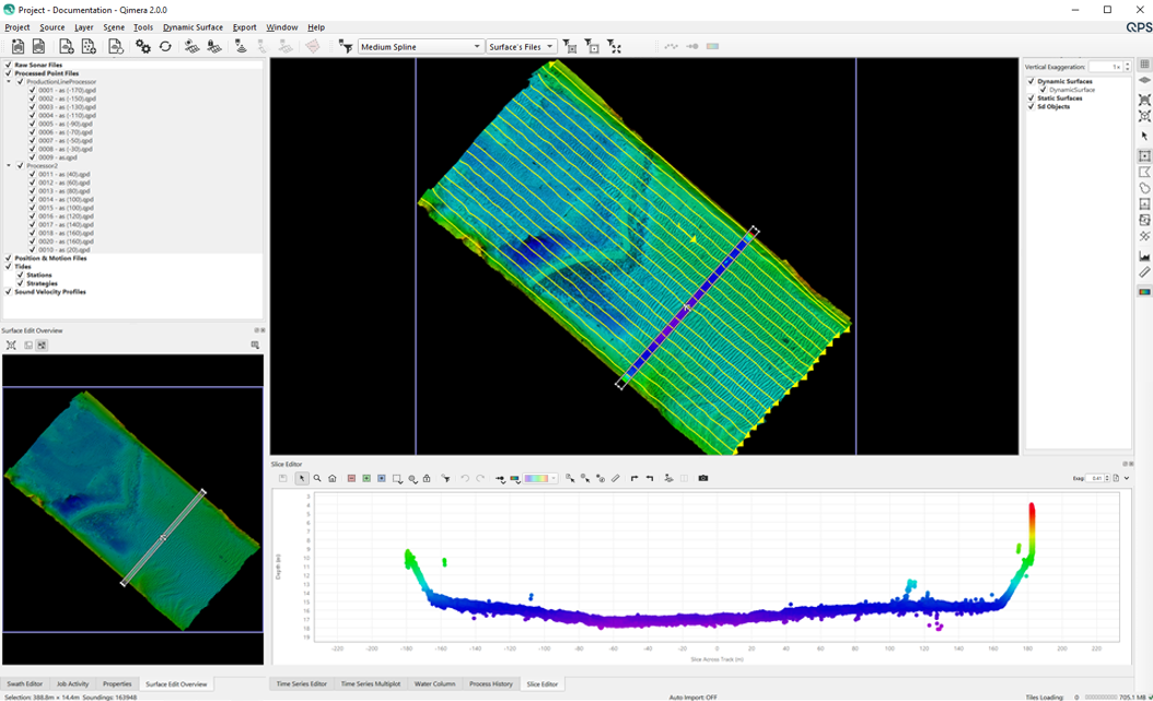 The series of images below show two separate sets of data being processed to get from raw sensor data to georeferenced soundings. The third image shows the QPD results from the first two small projects being merged into an assembly project, with the Slice Editor being used to verify the line up between the two different data sets. It's important to note that the QPDs are shared between the processing project and the main project; it is up to the user to ensure that you do not attempt to write to QPDs at the same time. The workflows for which this is meant to be used largely protect against this since data should not be submitted for inclusion in the master project until the mathematical processing is done. Specifically, when the mathematical processing project is done and is closed. The main processor then pulls the data into the main project with the understanding that the mathematical processing project will not be re-opened unless the surveyor is directed to do so, which would only be necessary should problems arise. Human coordination is essential in orchestrating this process, and avoids complex resource locking schemes in other software packages which will sometimes lock users out of their data. Humans are superior to machines in coordinating, and the functionality of this process performs optimally via human coordination and working together.