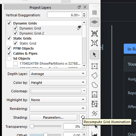 This attribute is used by Dynamic and Static Grid layers. This button launches the Shading Parameters dialog. The "Refresh" Icon will Recompute the Grid Illumination. This will launch a job to re-compute the grid illumination for the currently selected Dynamic Grid. This option is relevant only if you are in Mixed Shading mode. This is typically done automatically during dynamic grid generation. If you have an active selection, the computation will be done within the minimum bounding rectangle of that selection.