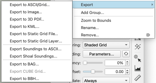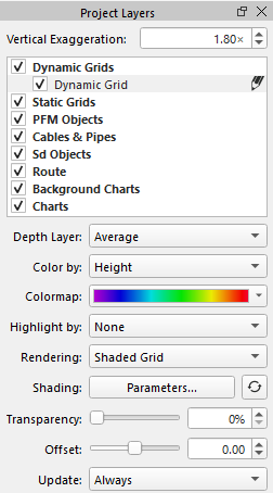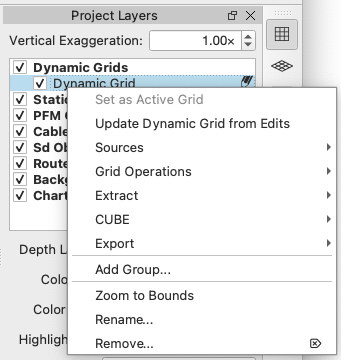 Dynamic grids are grids created from raw sonar or processed point source files and which automatically update when the underlying soundings are changed. Dynamic grids are the backbone of Qimera's point cleaning workflow. Most editing and filtering operation are conducted on a dynamic grid.