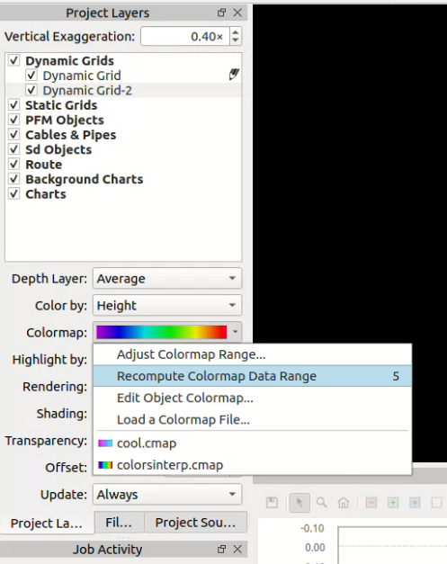 This popup allows you to see the currently selected colormap. It also allows you to select a colormap file, edit the current colormap, adjust the colormap range, and recompute the colormap range for the selected dynamic grid (not the active Dynamic Grid) based on the accepted data range. Recomputing the colormap range will also change the user range to the accepted data range.