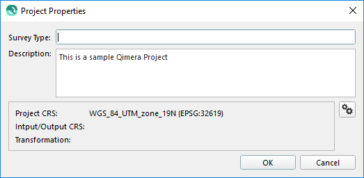 The user may edit the survey type and description and it will be saved to the project xml file. Editing of the coordinate reference system is only allowed if no data has been added to the project. If you have no data, you can click the