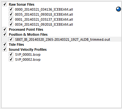 These nodes represent imported data or data extracted from raw sonar files during import. They are displayed here so that you can more easily delete them if they are not needed. They are used during Sound Velocity Correction. A list of supported file formats can be found here.