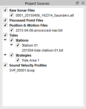 The Project Sources tab of the Source Files Panel shown in the Source Files Tab figure above shows all of the files currently loaded into a project. If you have loaded directories of files, the directory hierarchy will be preserved in the Source Files Tree. There are 5 primary root nodes in the tree. Raw Sonar Files, Processed Point Files, Position & Motion Files, Tide Files and Sound Velocity Profiles.