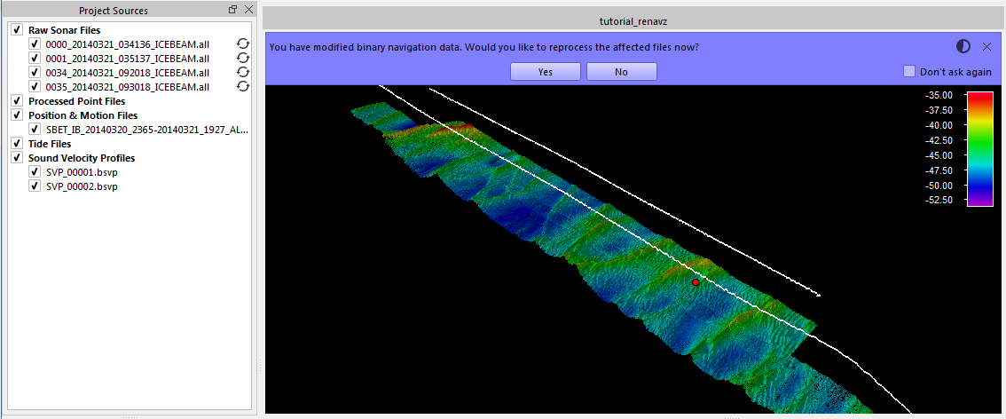 Once the GNSS height data is imported, Qimera's Dynamic Workflow engine prompts the user what needs to be done. If you check Don't Ask Again before clicking on Yes, Qimera will automatically perform this task in the future. Once you click Yes, the Job Activity window will display the running task. If you click No, Qimera will wait for you to later click on the Auto Solve button. You don't have to remember which type of operation needs to be performed on the file, because the operations all have a precedence. So if you change something for this line that requires full sound velocity correction, this job will not be doubly performed. The Dynamic Workflow engine takes care of this for you.