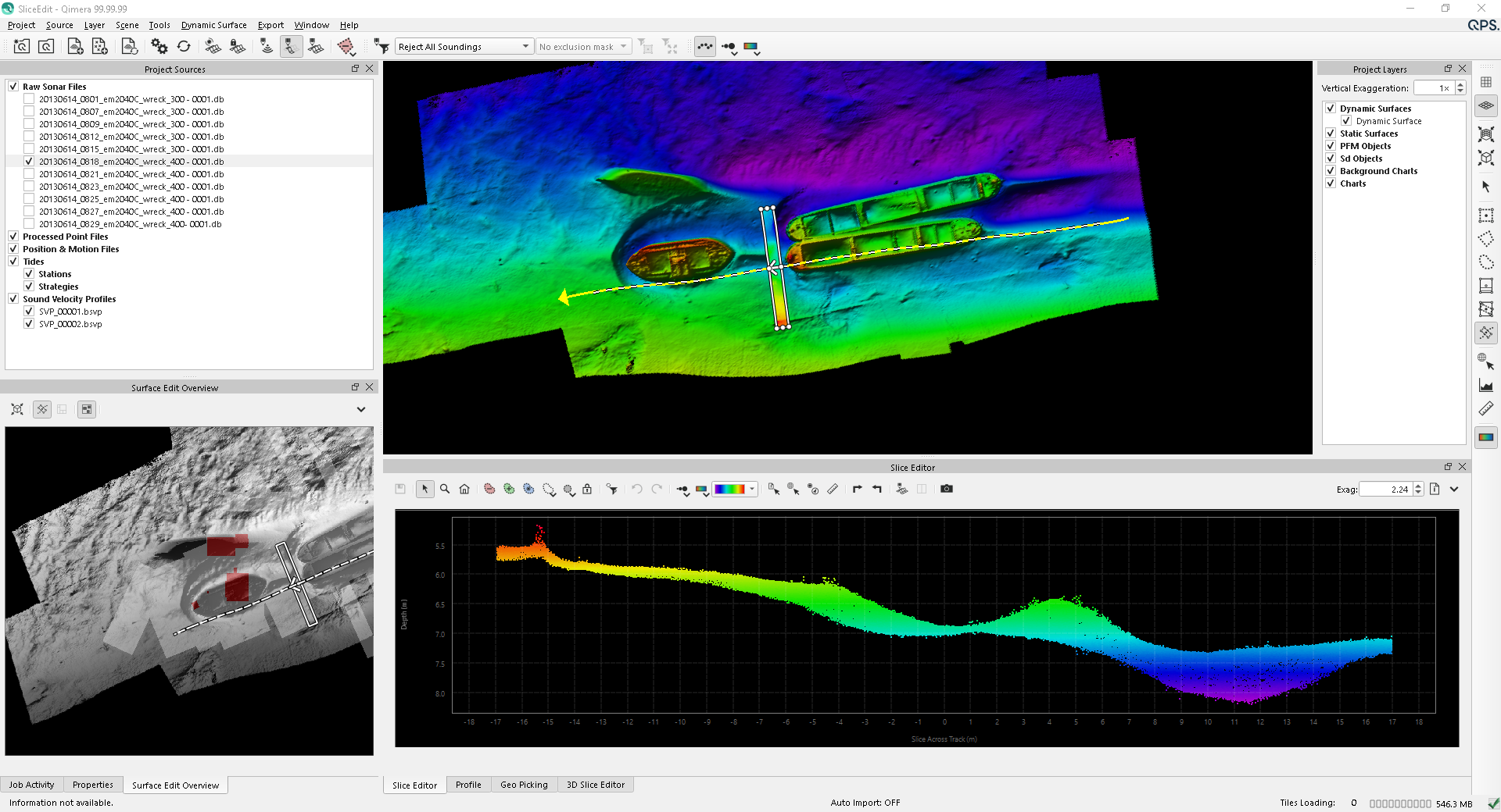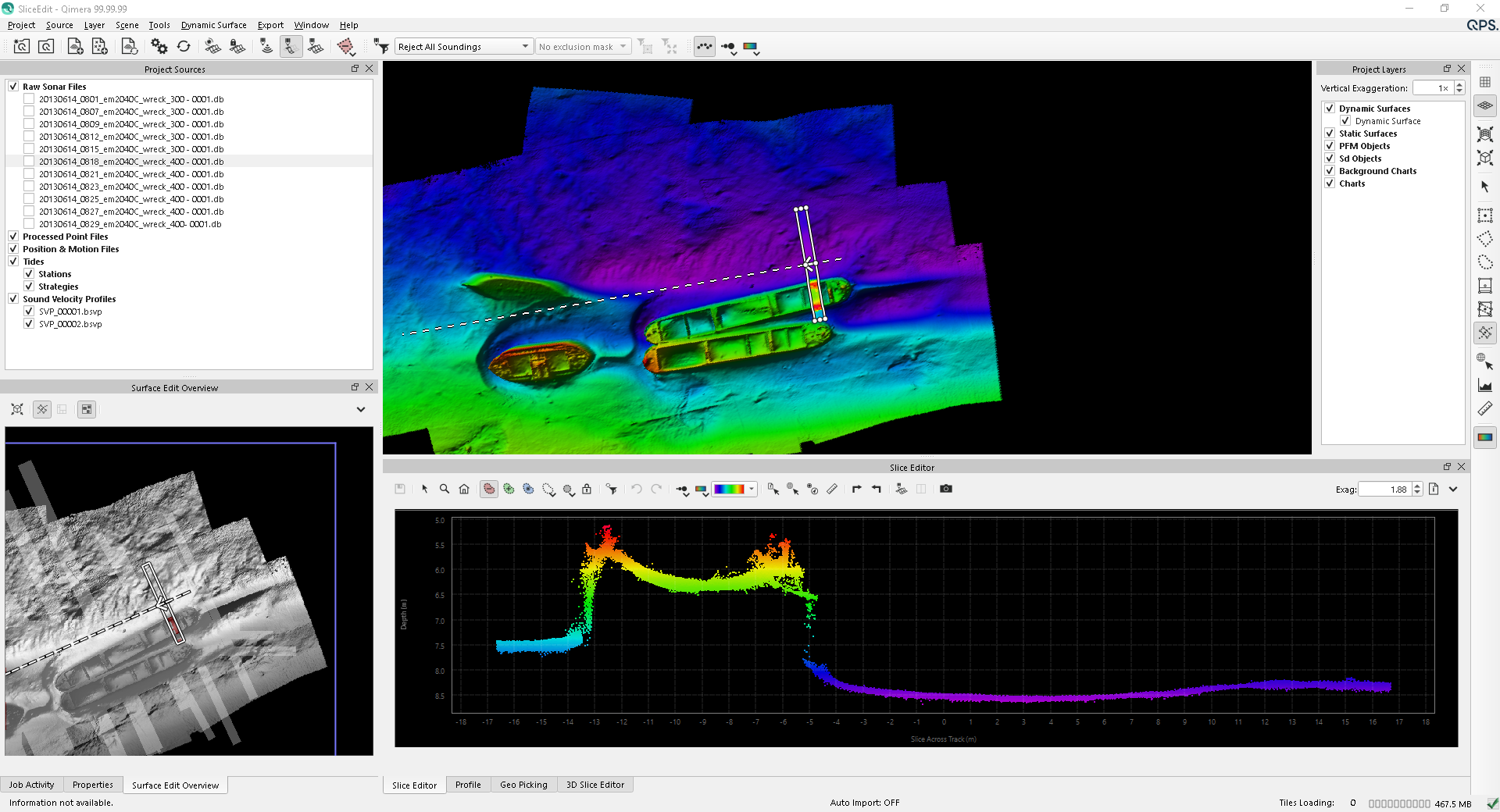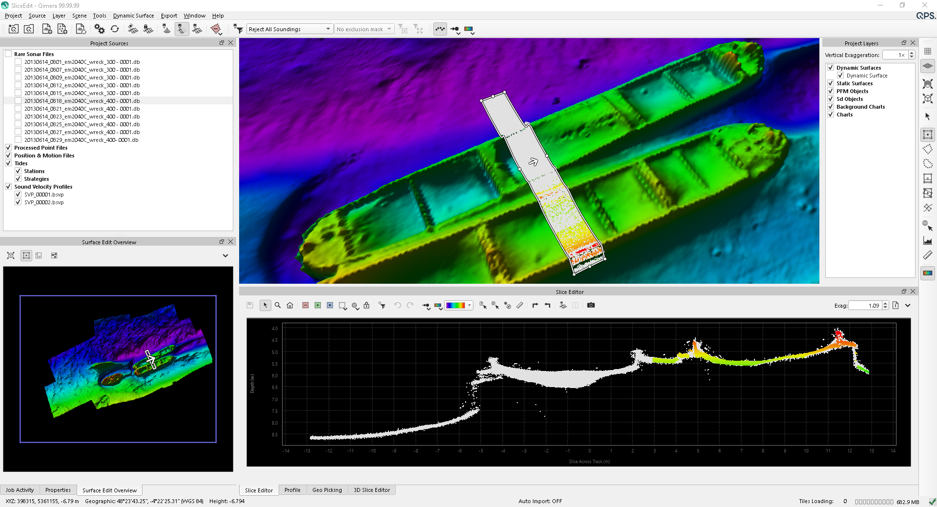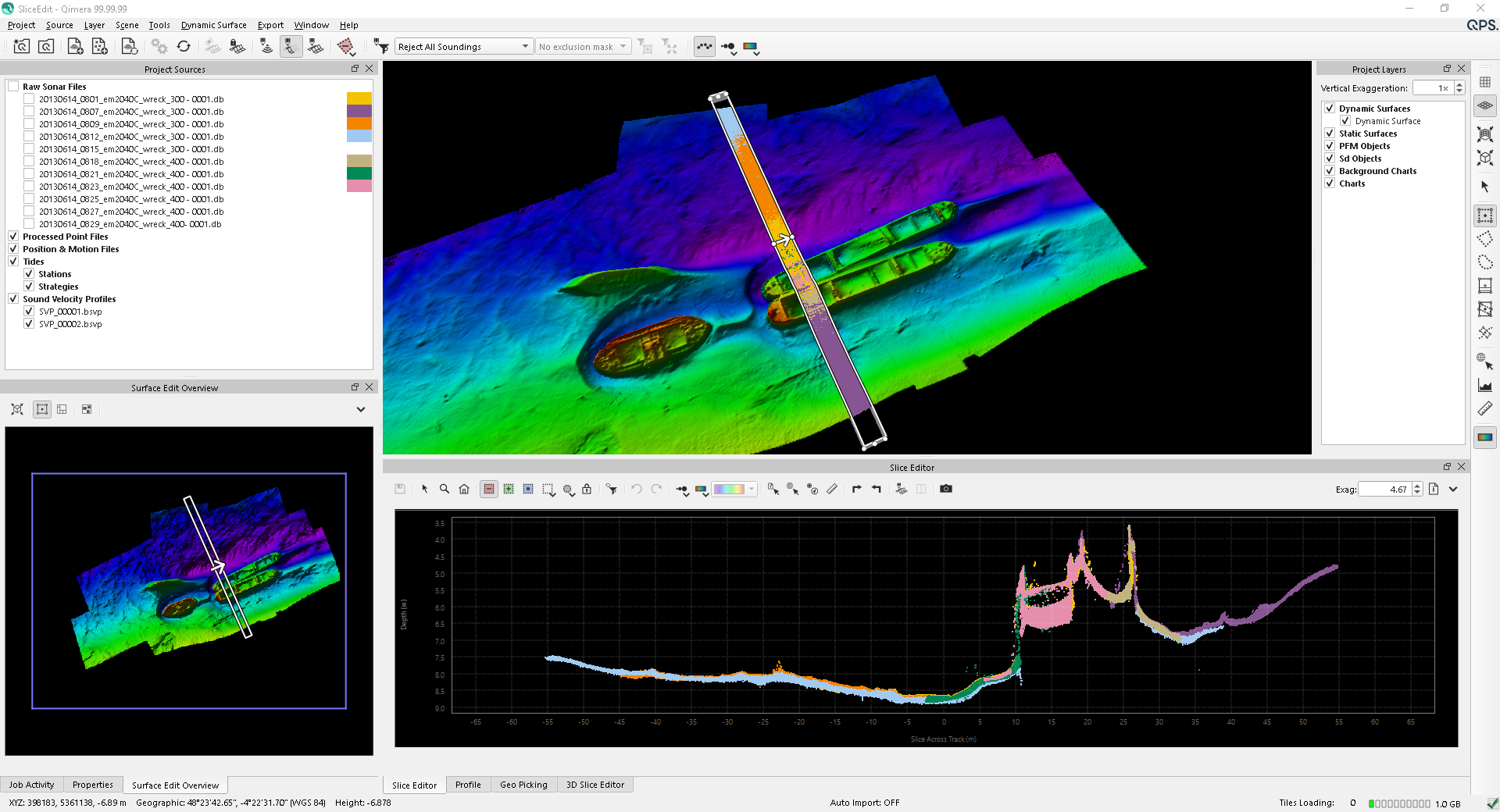 To start slice editing, simply click the button from the Bathymetry Toolbar. The 2 key is also the default hot key for this mode. This will create a default Free Slice selection in the middle of your Dynamic Grid. You can also create your own area selection to start. Slice editing works in either a Manual Area, GuidedArea or Linked Area editing mode. All of these modes are described in detail below. If you are using Rectangle, Freehand, or Polygon selection mode, Qimera will load all of the soundings that fall within the selection in to the Slice Editor. If you are using Fixed Slice or Free Slice, Qimera will load only the soundings within the slice portion of the selection into the Slice Editor. The 4D Scene will show all of the soundings within the Overview area portion of a slice selection, or main selection if using any other selection mode. An example of this using the Fixed Slice selection is shown below.