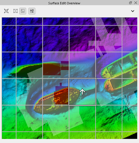 The Slice Editor works in tandem with the 4D Scene and the Grid Editor Overview. See the specific sections on these windows for additional information. The key is that you can change the selection in either the 4D Scene or the Grid Edit Overview. The Grid Edit Overview allows you to maintain an awareness of your current edit area with respect to your entire survey. The Grid Edit Overview also allows you to see the progress of your editing and display a partitioned grid that allows you to systematically edit your grid. See the section on Guided Editing below for information on using a partition overlay.