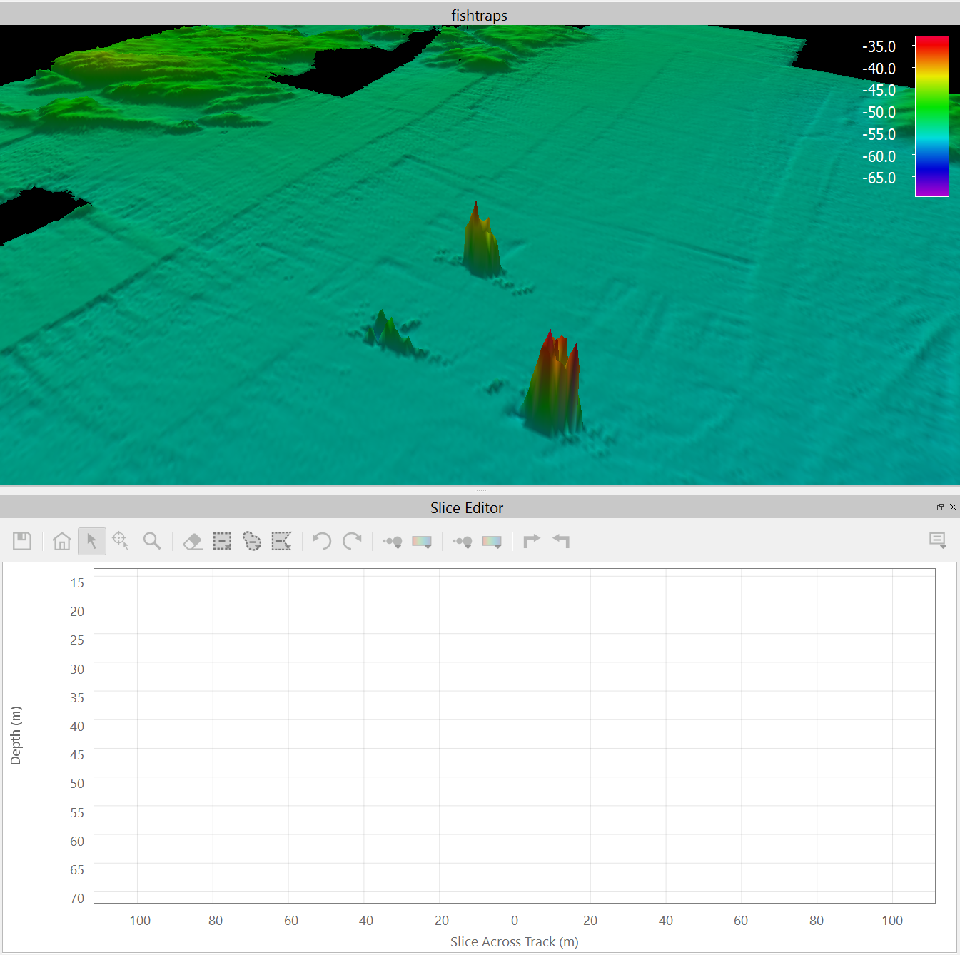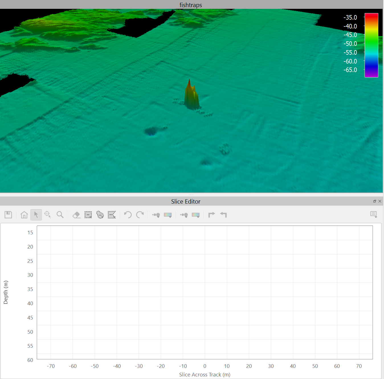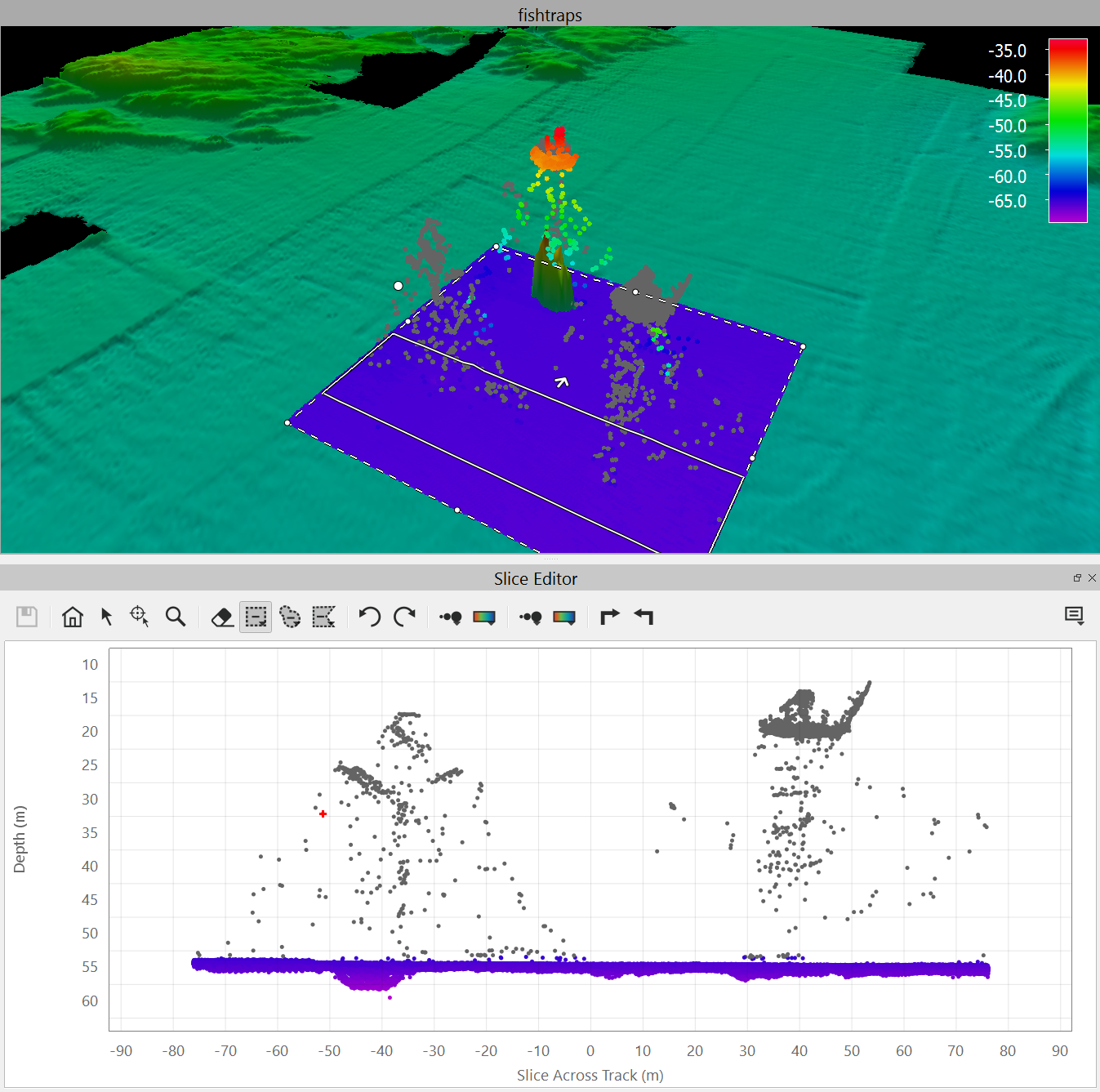 The Slice Editor allows you to edit the soundings of your grid in a 2D projected widget. The Slice Editor uses any of the area selection modes but is primarily used with the Fixed Slice Select or Free Slice Select. Use of these modes is described in detail in section 4D Scene Toolbar.