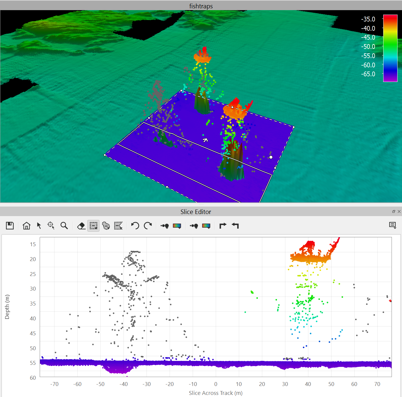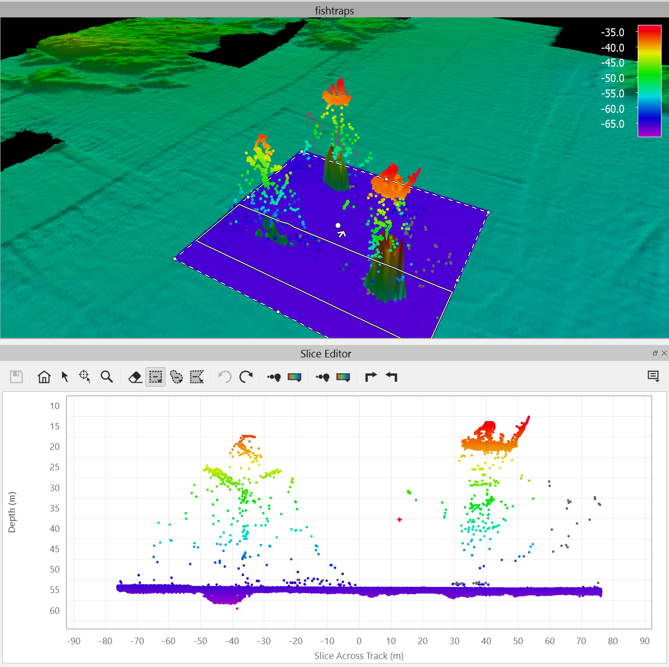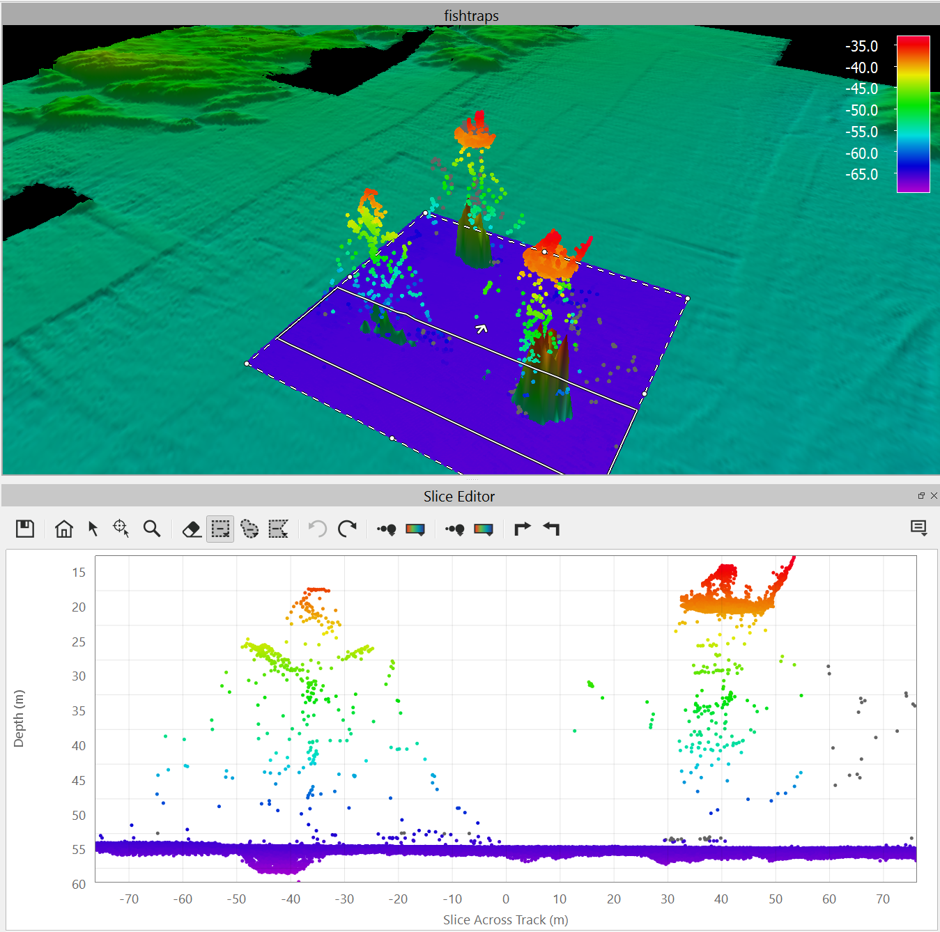 The Slice Editor allows you to edit the soundings of your grid in a 2D projected widget. The Slice Editor uses any of the area selection modes but is primarily used with the Fixed Slice Select or Free Slice Select. Use of these modes is described in detail in section 4D Scene Toolbar.