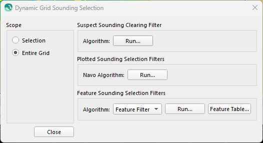 After selecting a dynamic grid from the layers window utilize this dialog for various sounding selection actions. If you have selected a rectangular area from the main window you can restrict the actions to the selected area by changing the scope from Entire Grid to Selection.