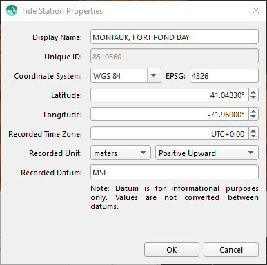 The dialog allows for creating or editing a Tide Station that can be used as a tide source for vertical referencing.