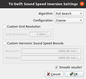 This dialog is for selecting and configuring the TU Delft Sound Speed Inversion algorithm of the users choice. This will be run on each of the selected raw sonar files using any available soundings in the selected dynamic surface to constrain the harmonic sound speed estimate.