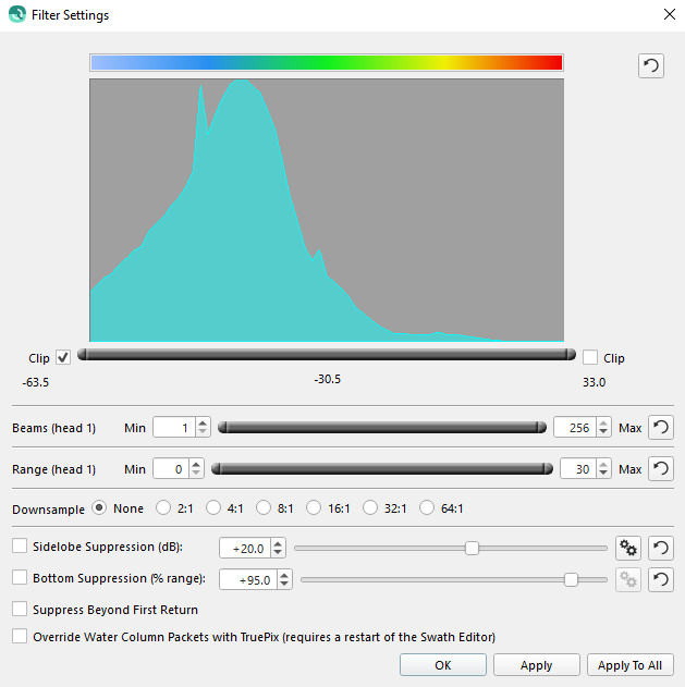 This dialog controls the display of the water column data within both the Fan and Side views of the data. It consists of a current histogram control, beam limit control, range limit control, down sample control, and specialized filtering.