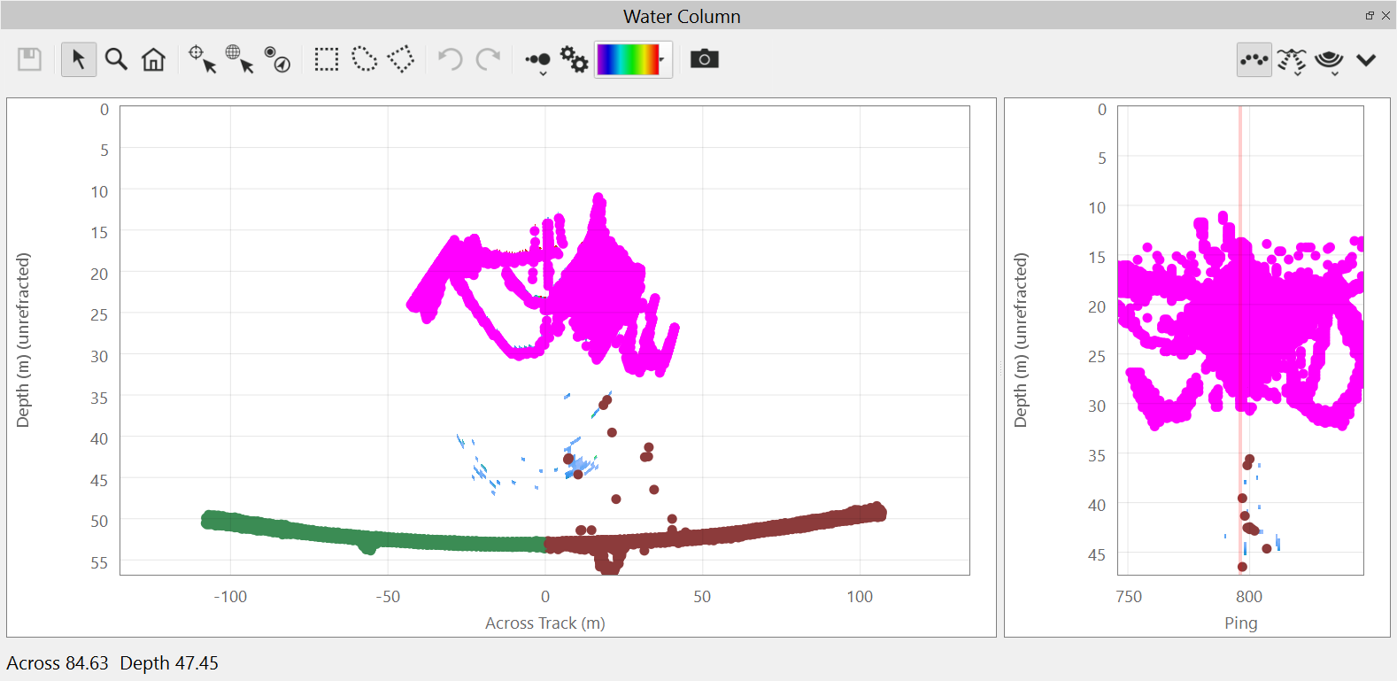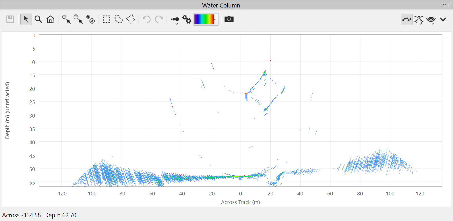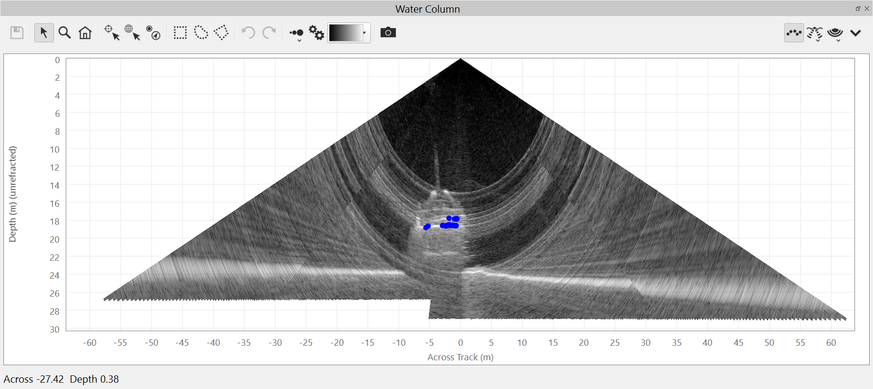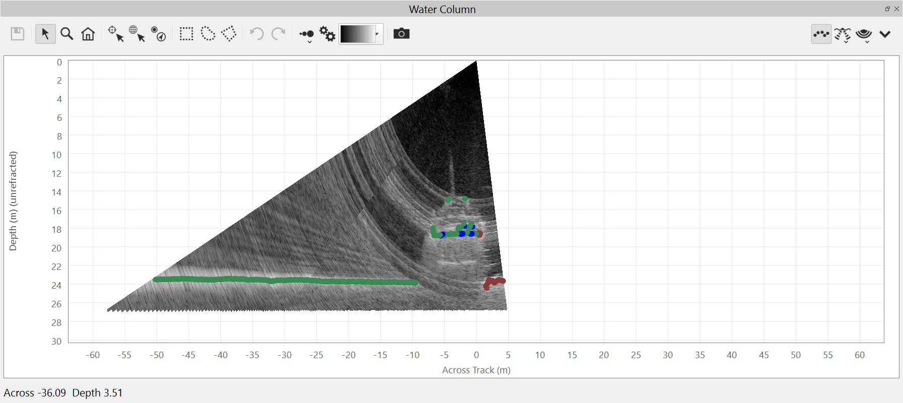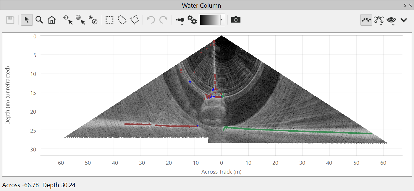 The water column view can also show the sonar computed soundings as points on the plot. The soundings views are controlled by the menu.