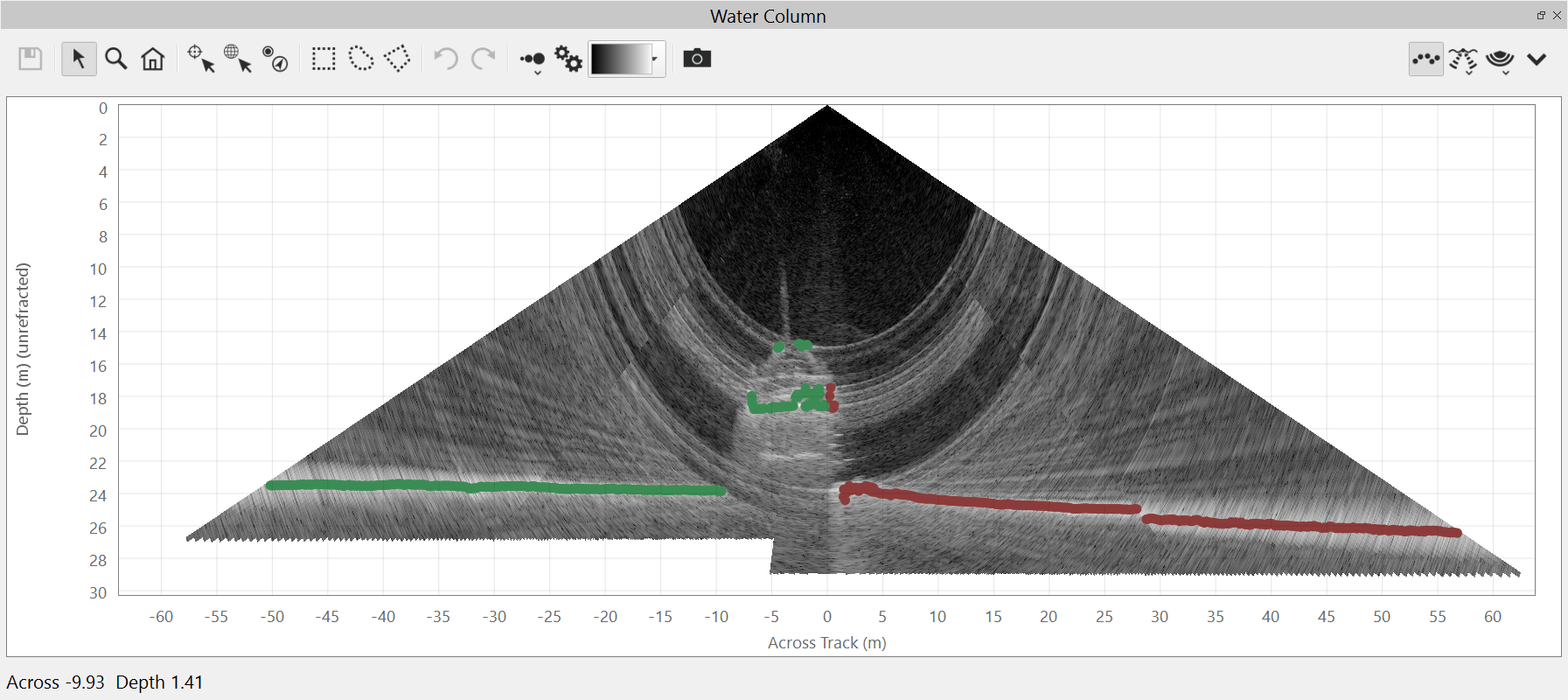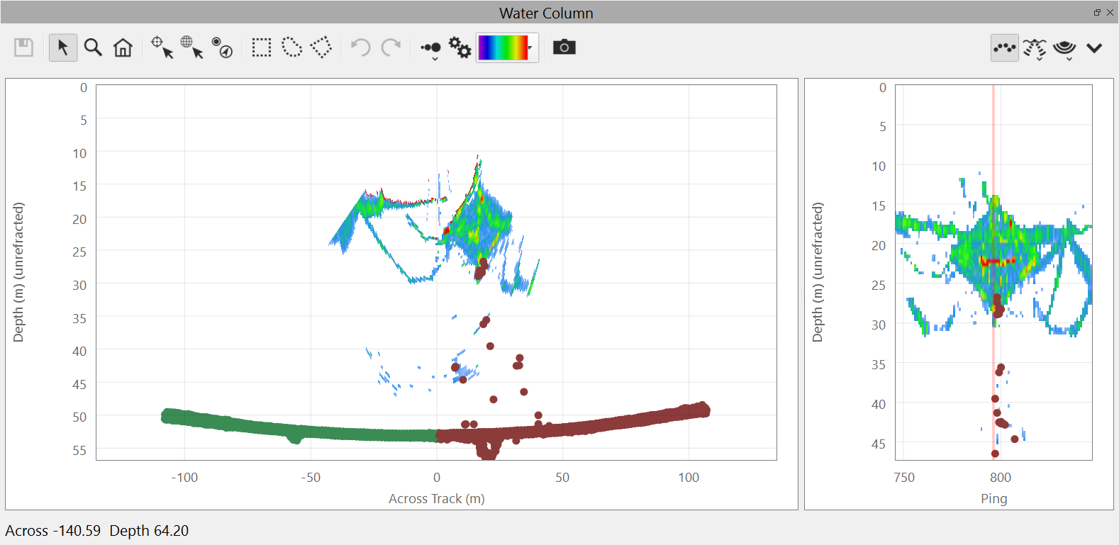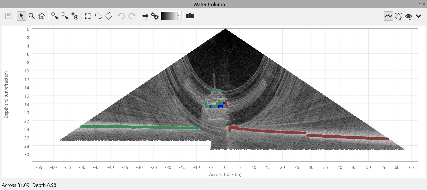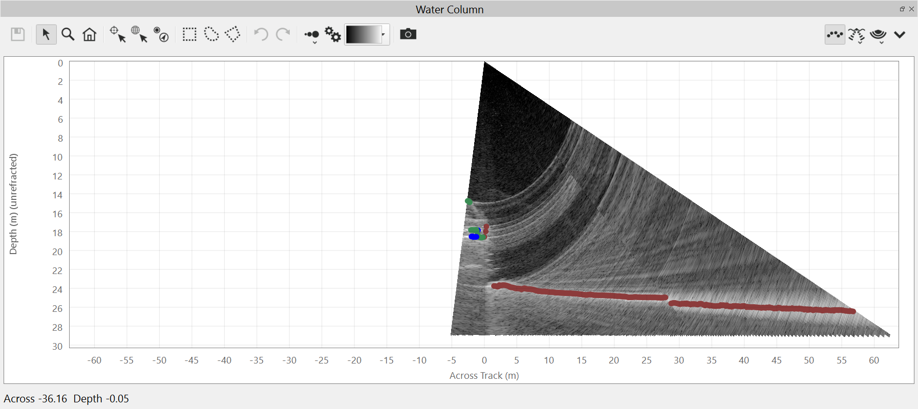 The water column view can also show the sonar computed soundings as points on the plot. The soundings views are controlled by the menu.