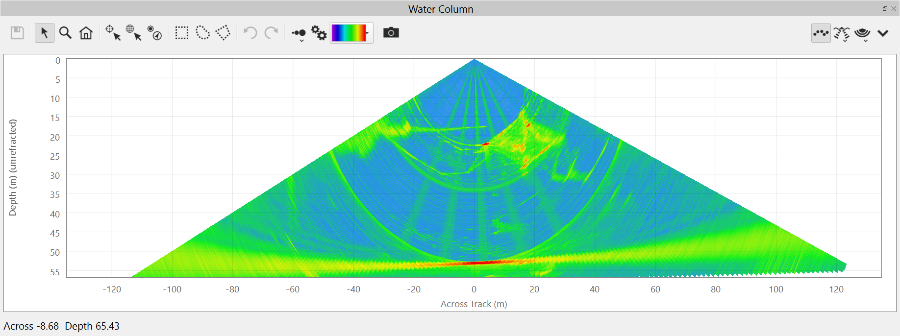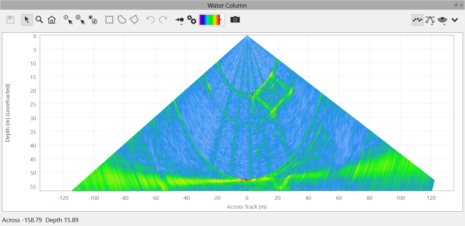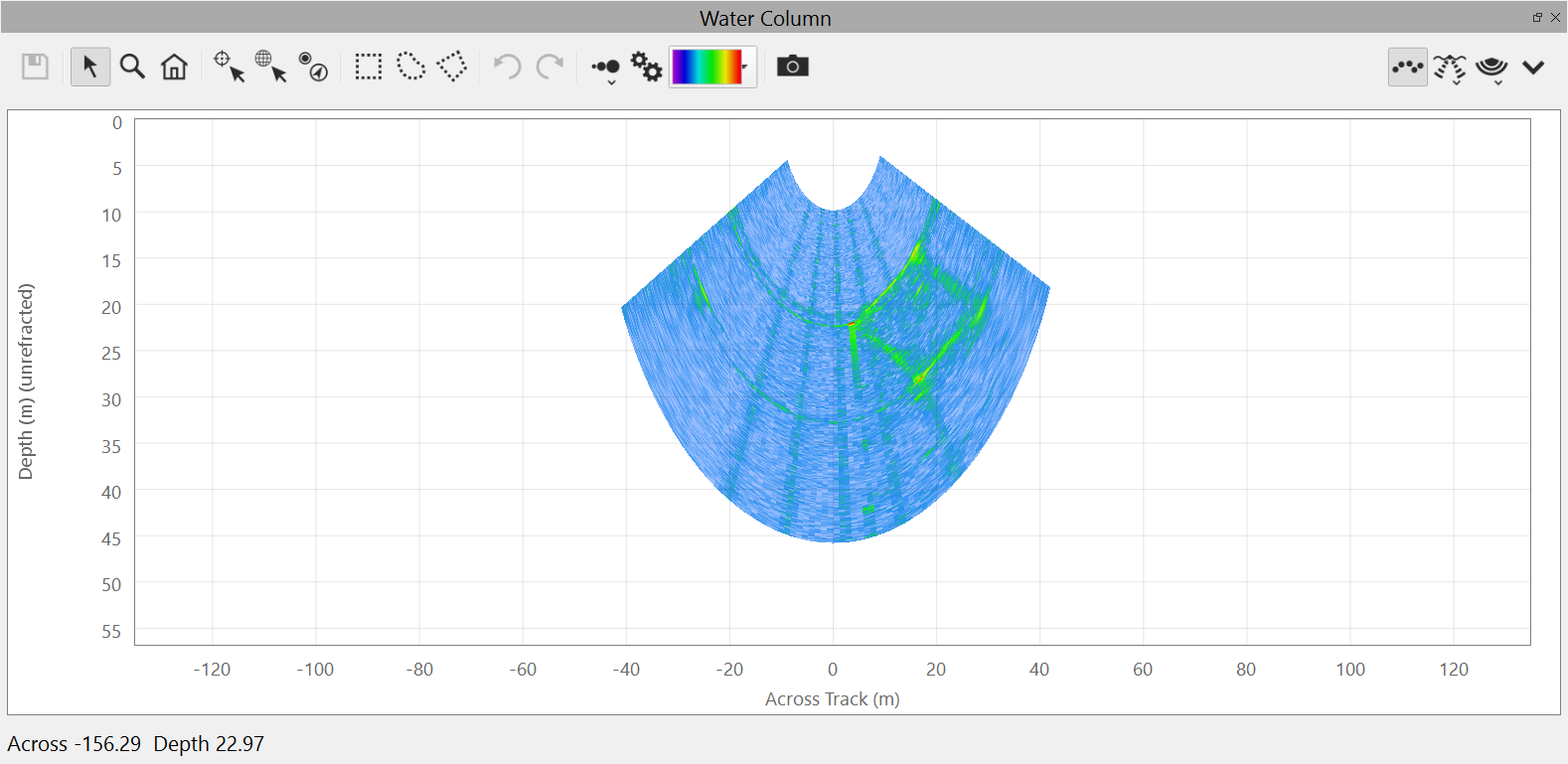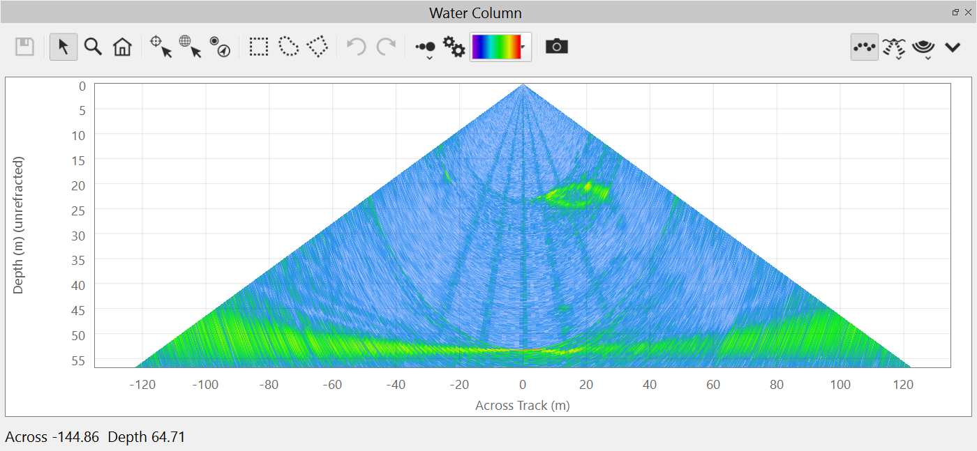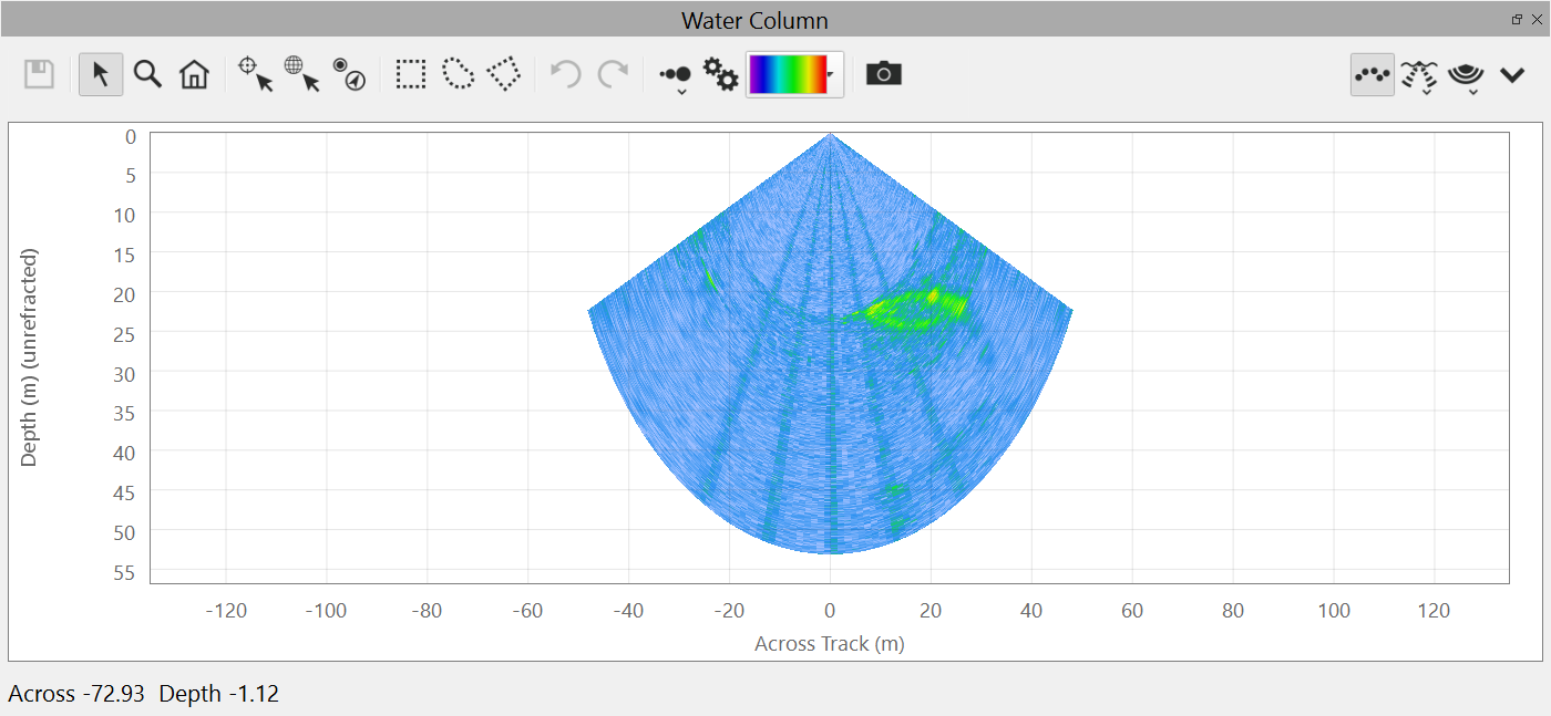 This is the default view of the water column fan. It shows the water column data from the current ping.