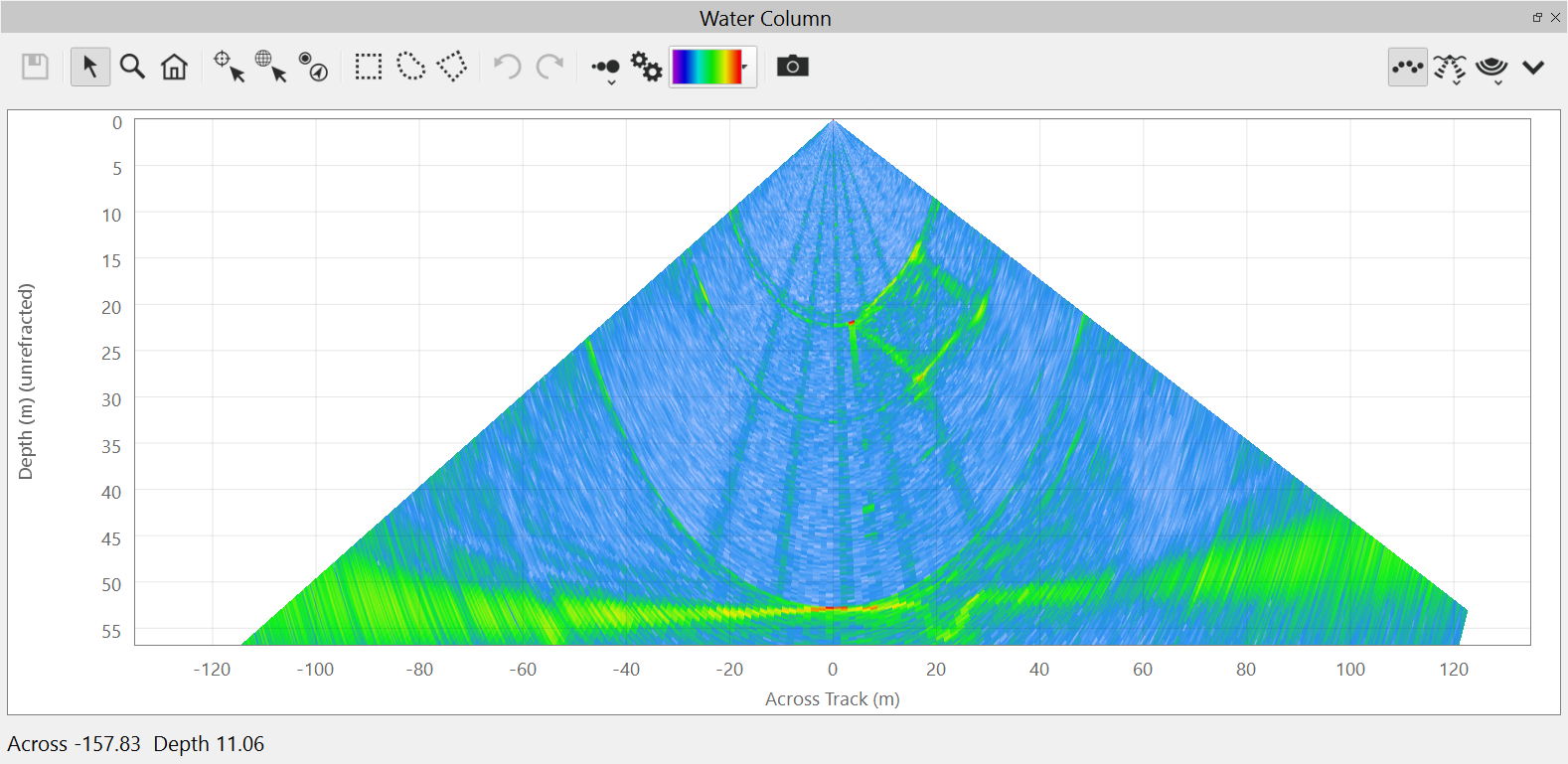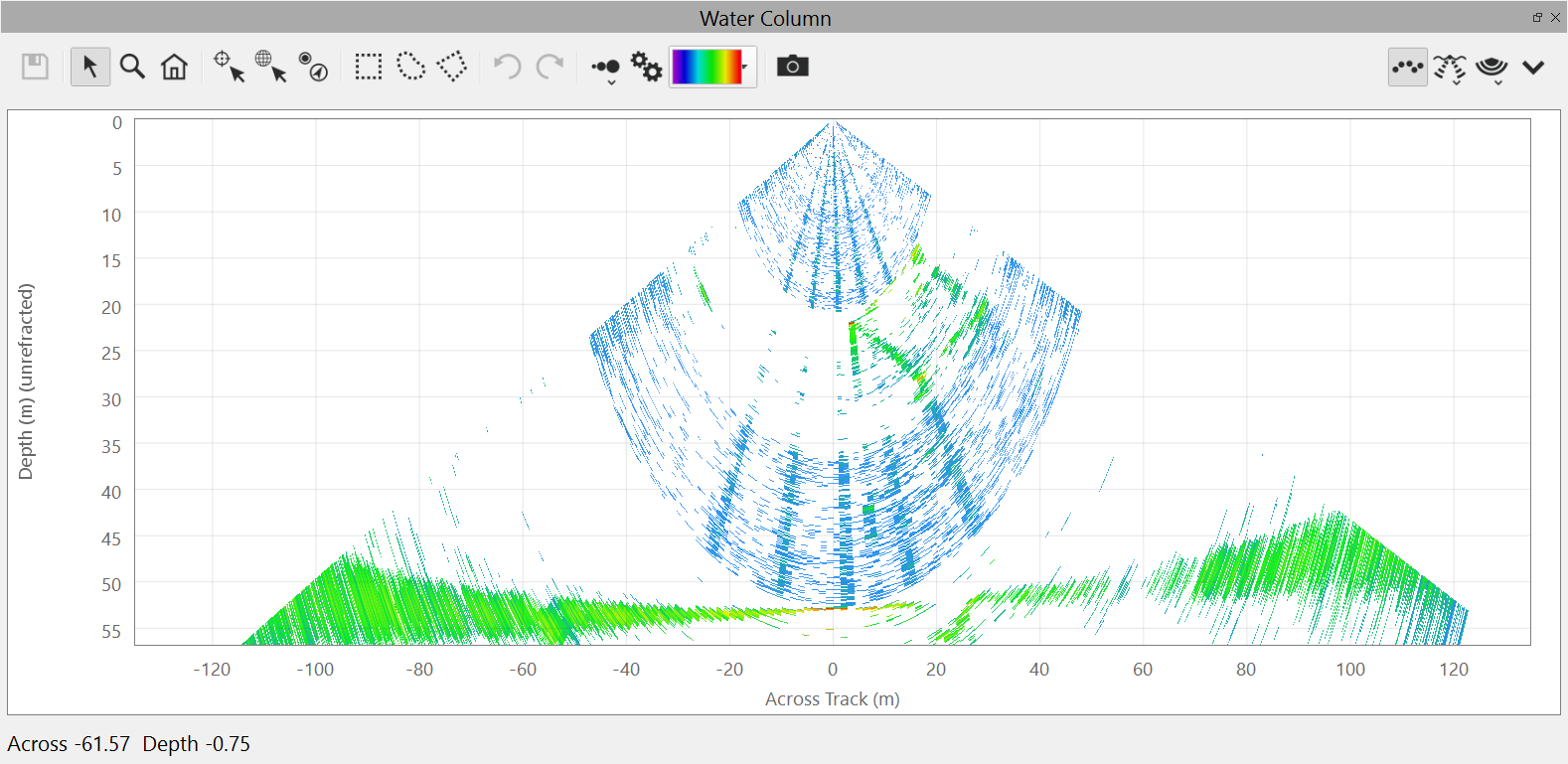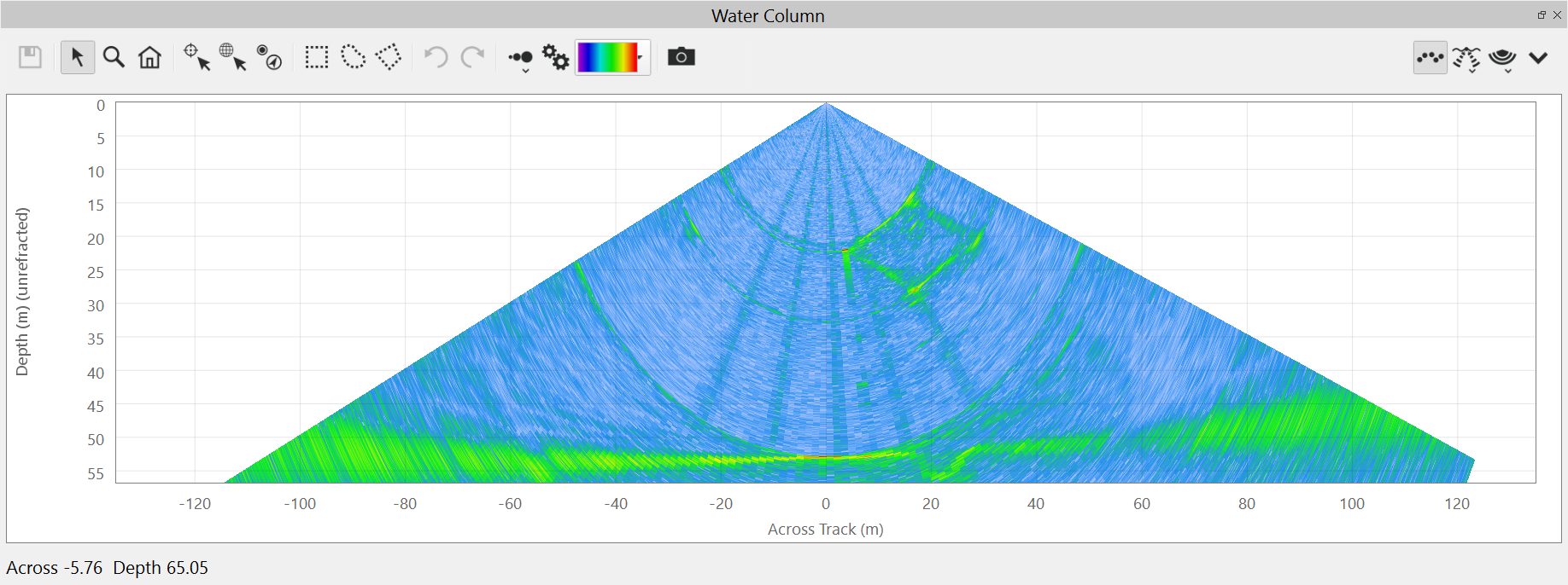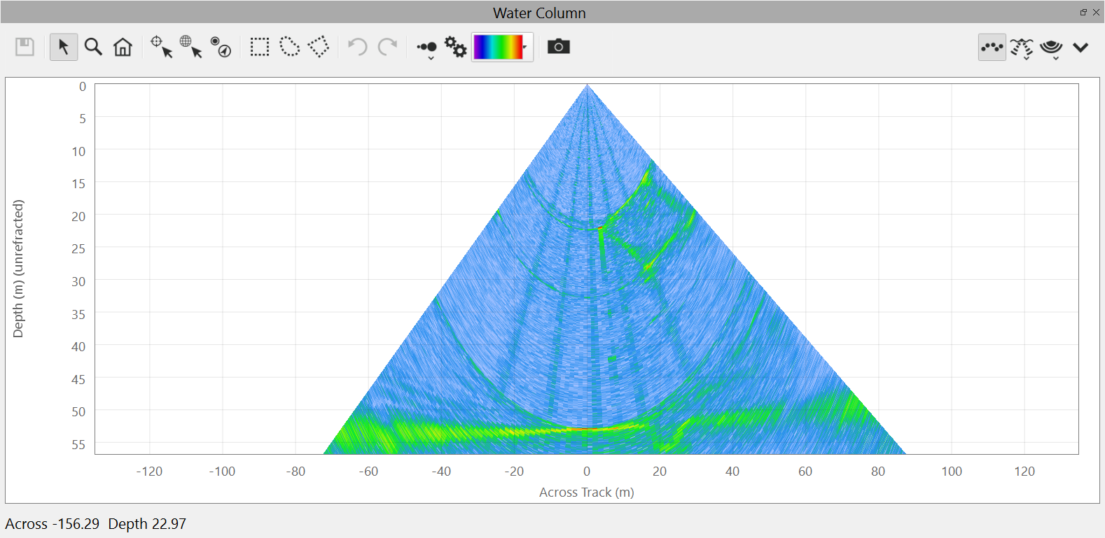 This is the default view of the water column fan. It shows the water column data from the current ping.
