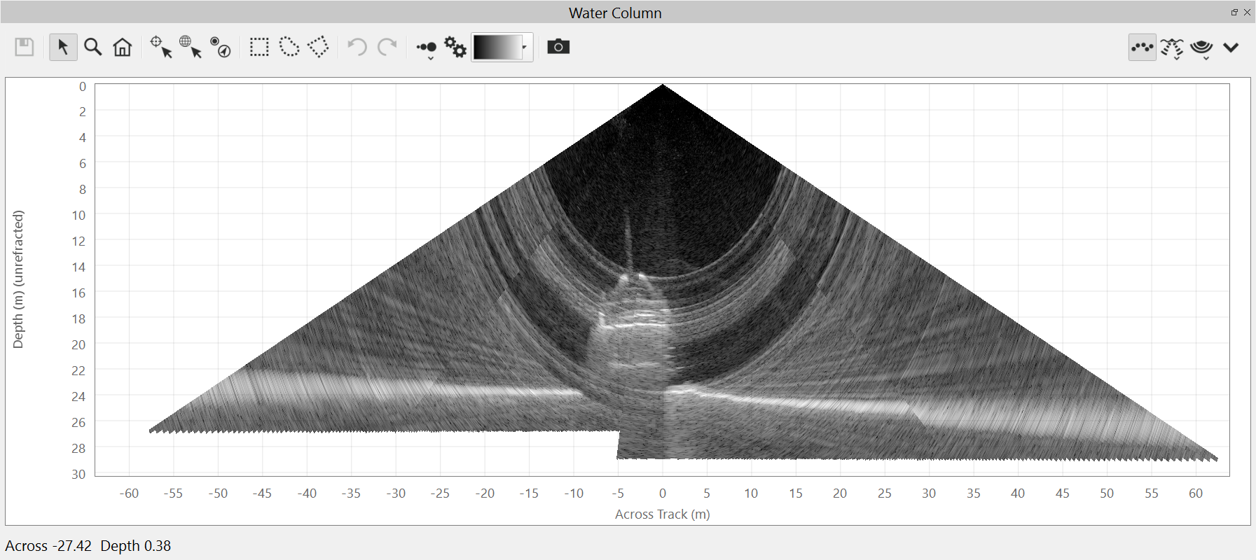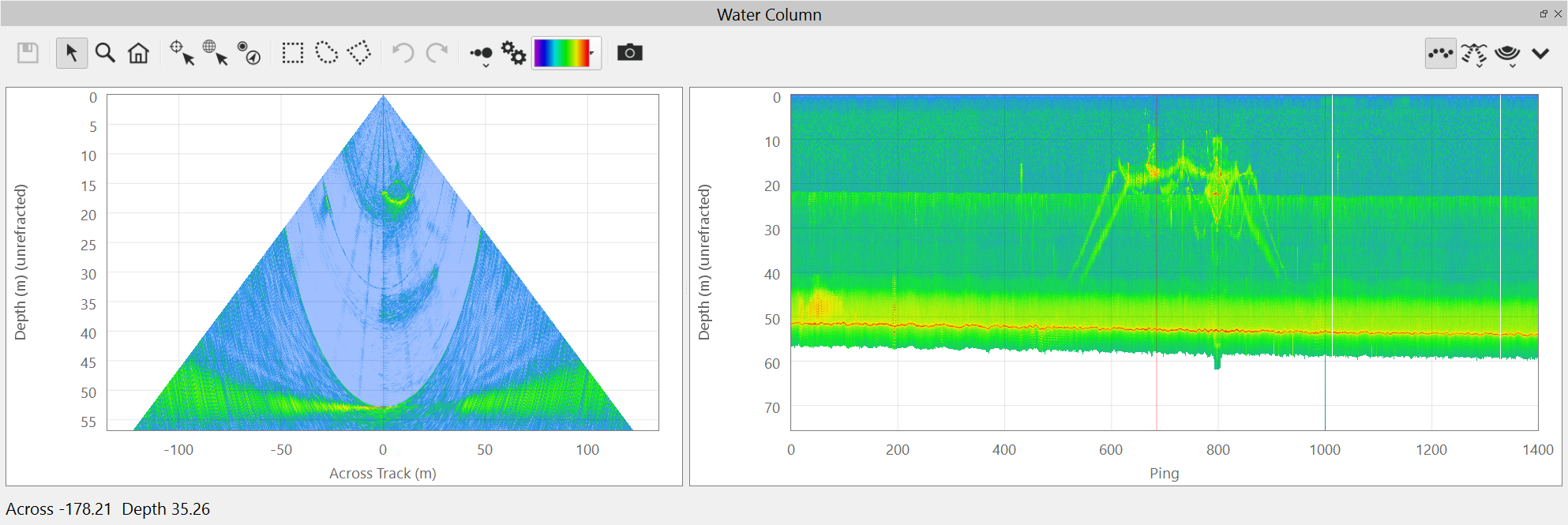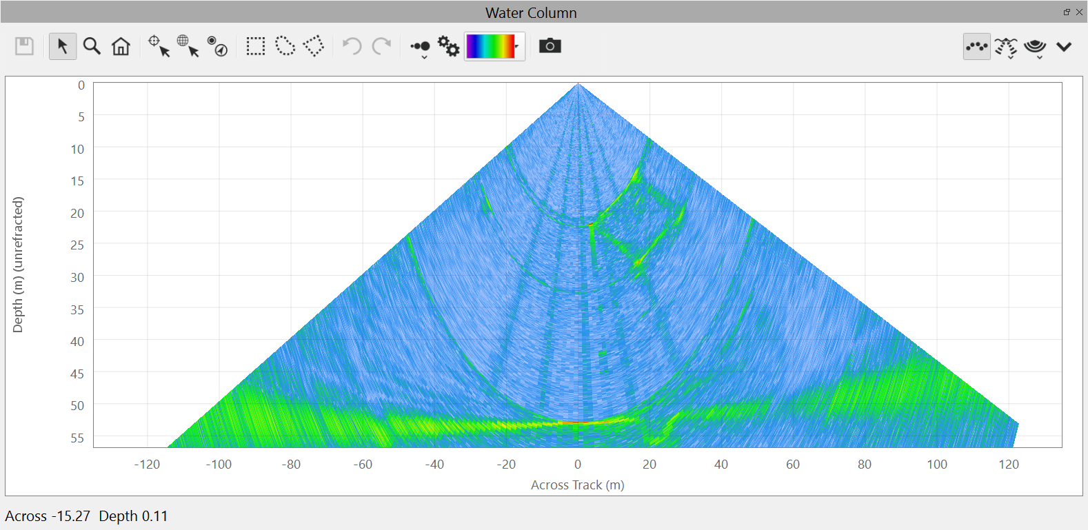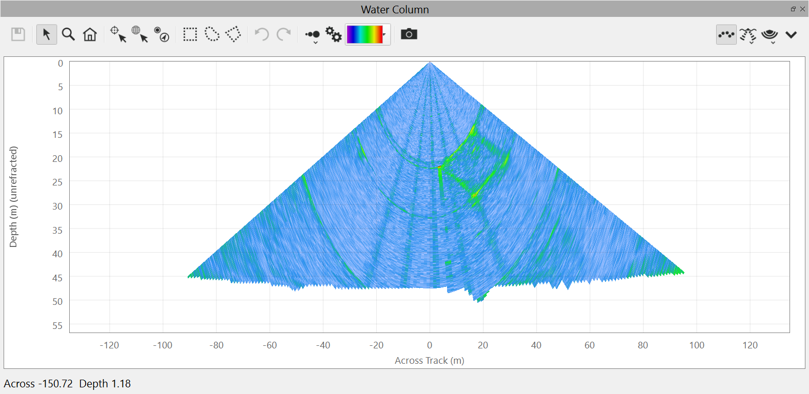 This is the default view of the water column fan. It shows the water column data from the current ping.