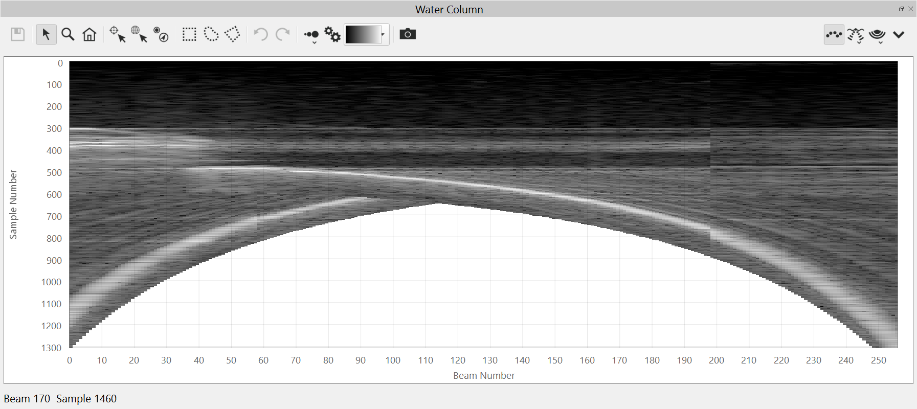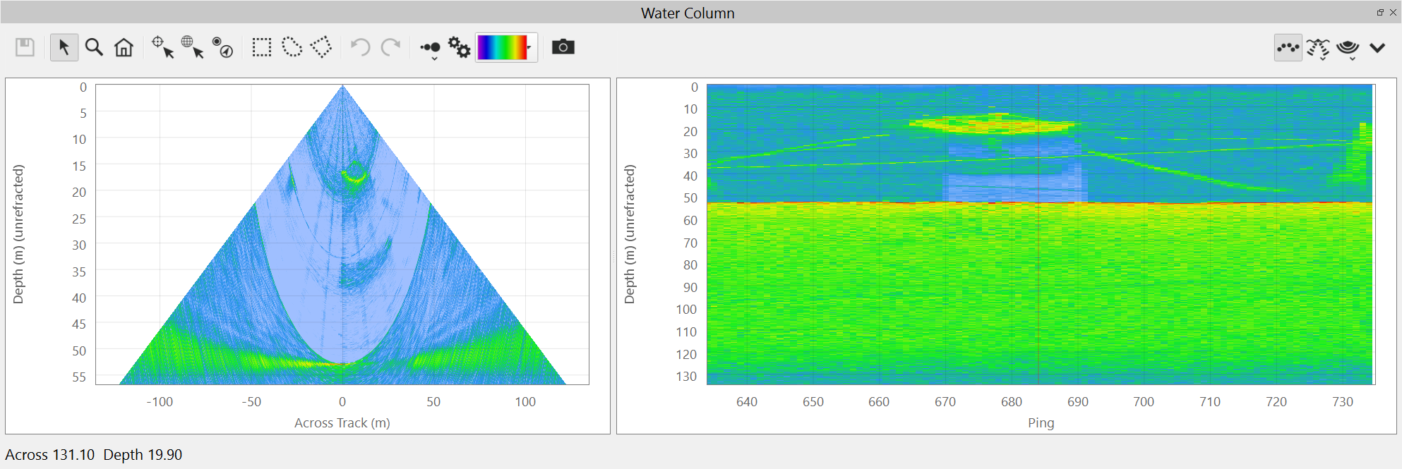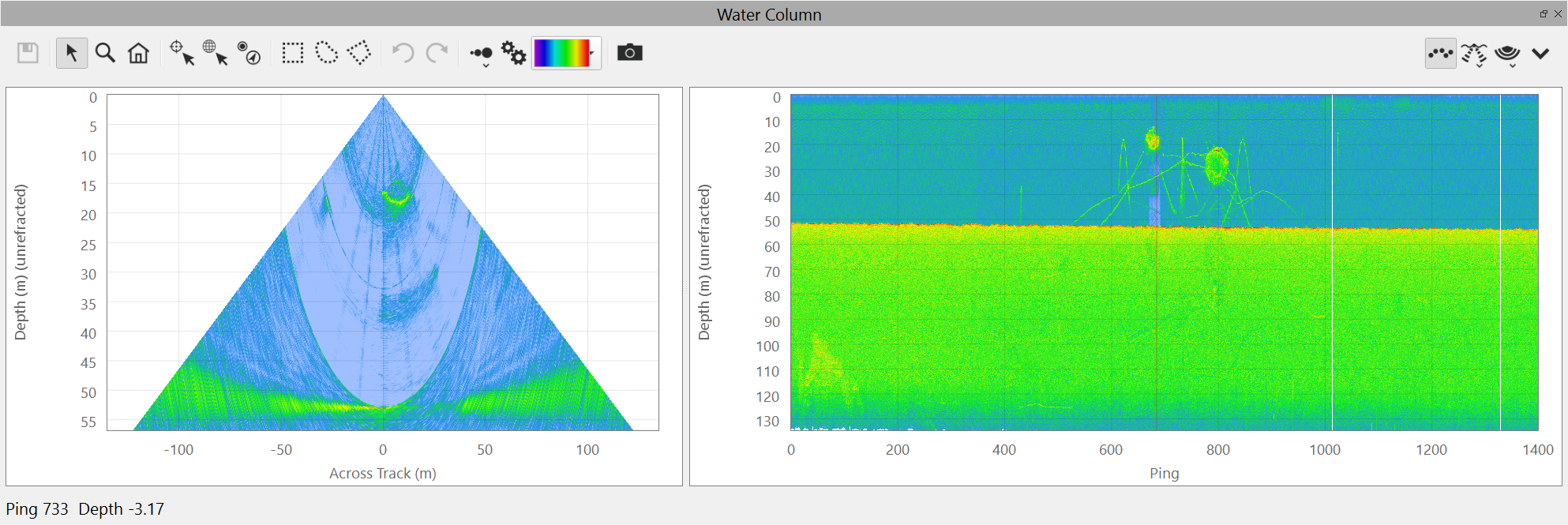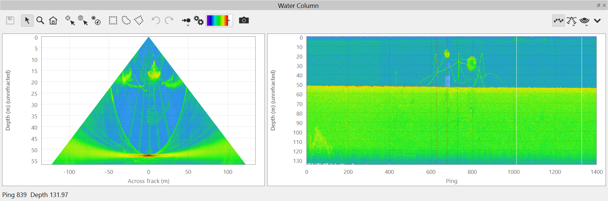 This is the default view of the water column fan. It shows the water column data from the current ping.