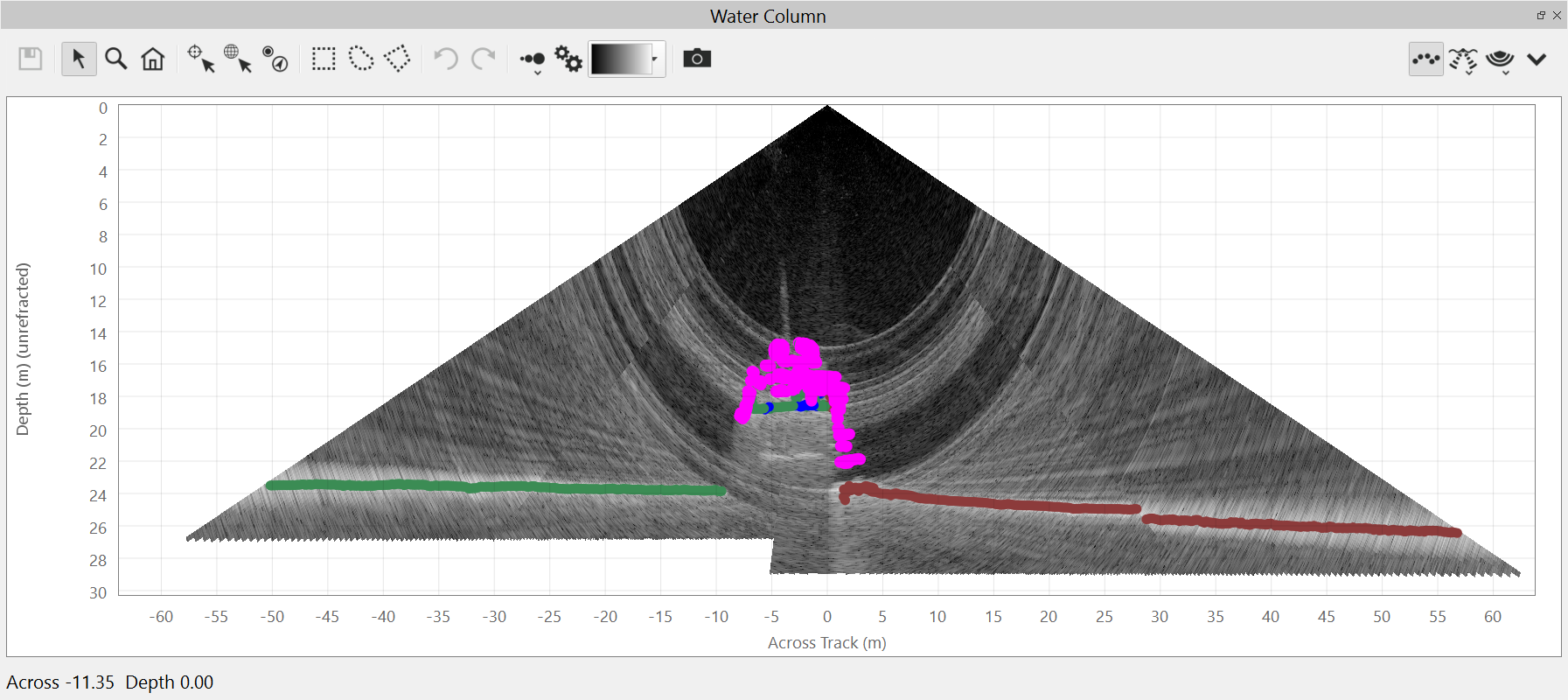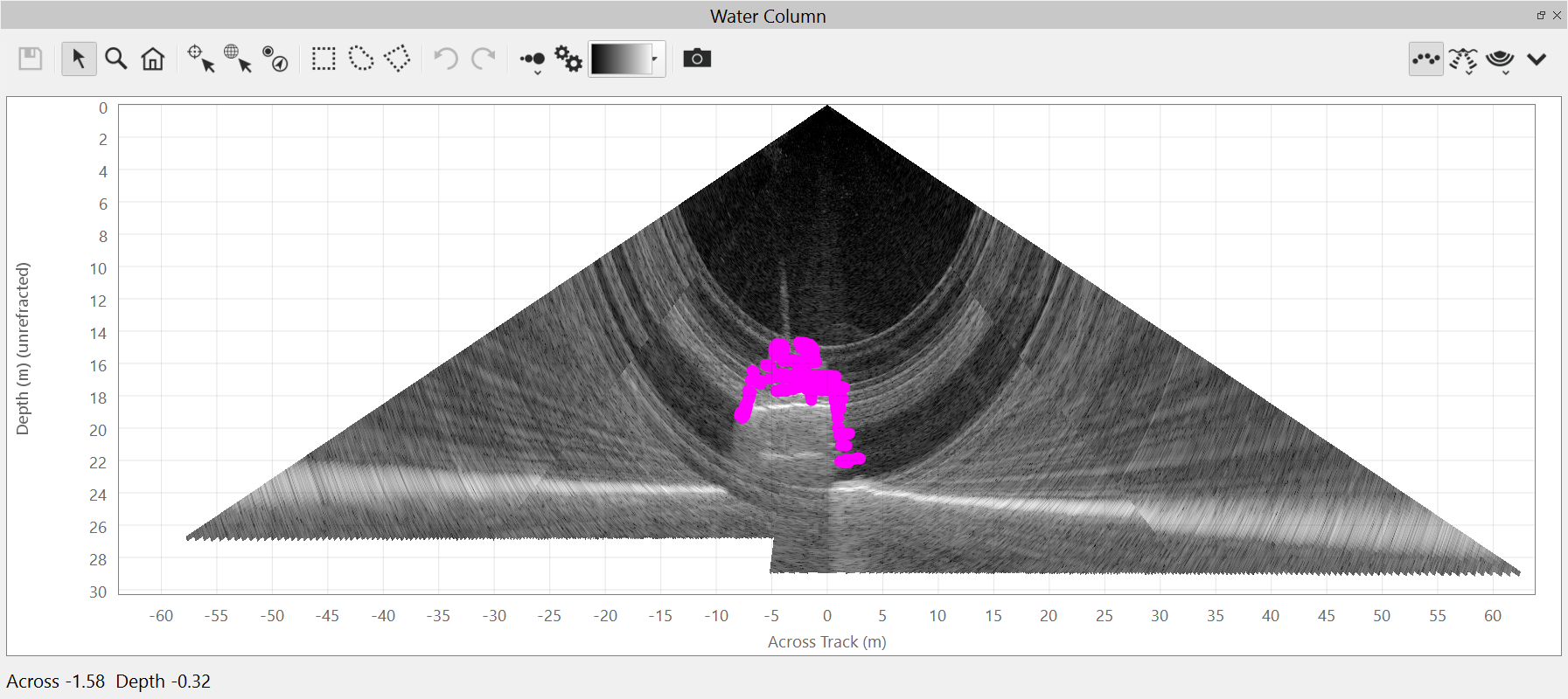This button places the cursor in Add Sounding mode. Each time you click a visible water column sample in the view, a sounding will be added for that ping, beam and range. If there is already an existing sounding within +/- 1 sample, no new sounding will be created. New soundings will appear as magenta dots, visible as an overlay to the water column view. You cannot add single soundings on a stacked fan or side view, you can only add single soundings on a single ping fan. This cursor mode is only available on the Fan View due to the ambiguous position of the pixel in the Side Views described below. Using this mode on the Side View will result in moving the current location to the "clicked" ping.