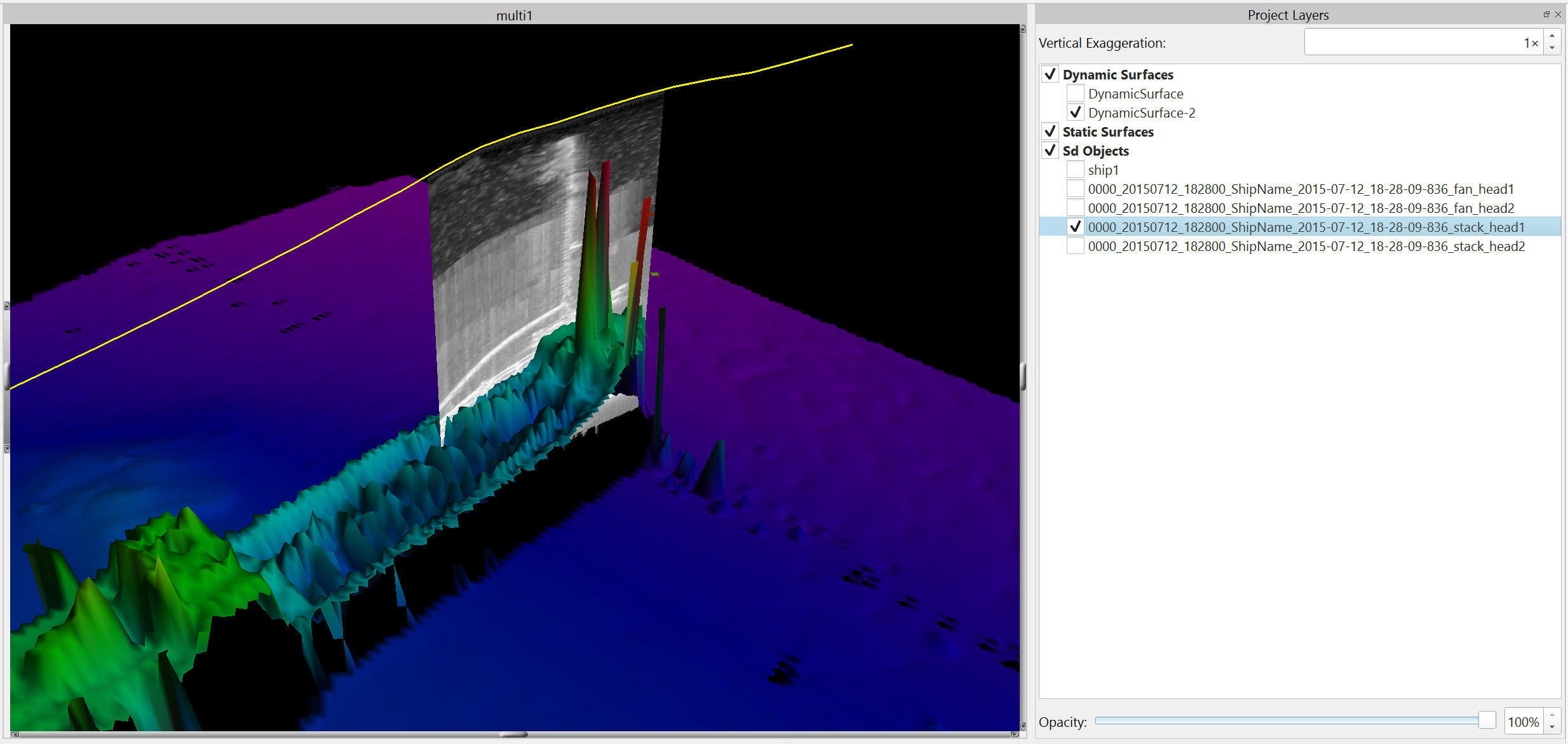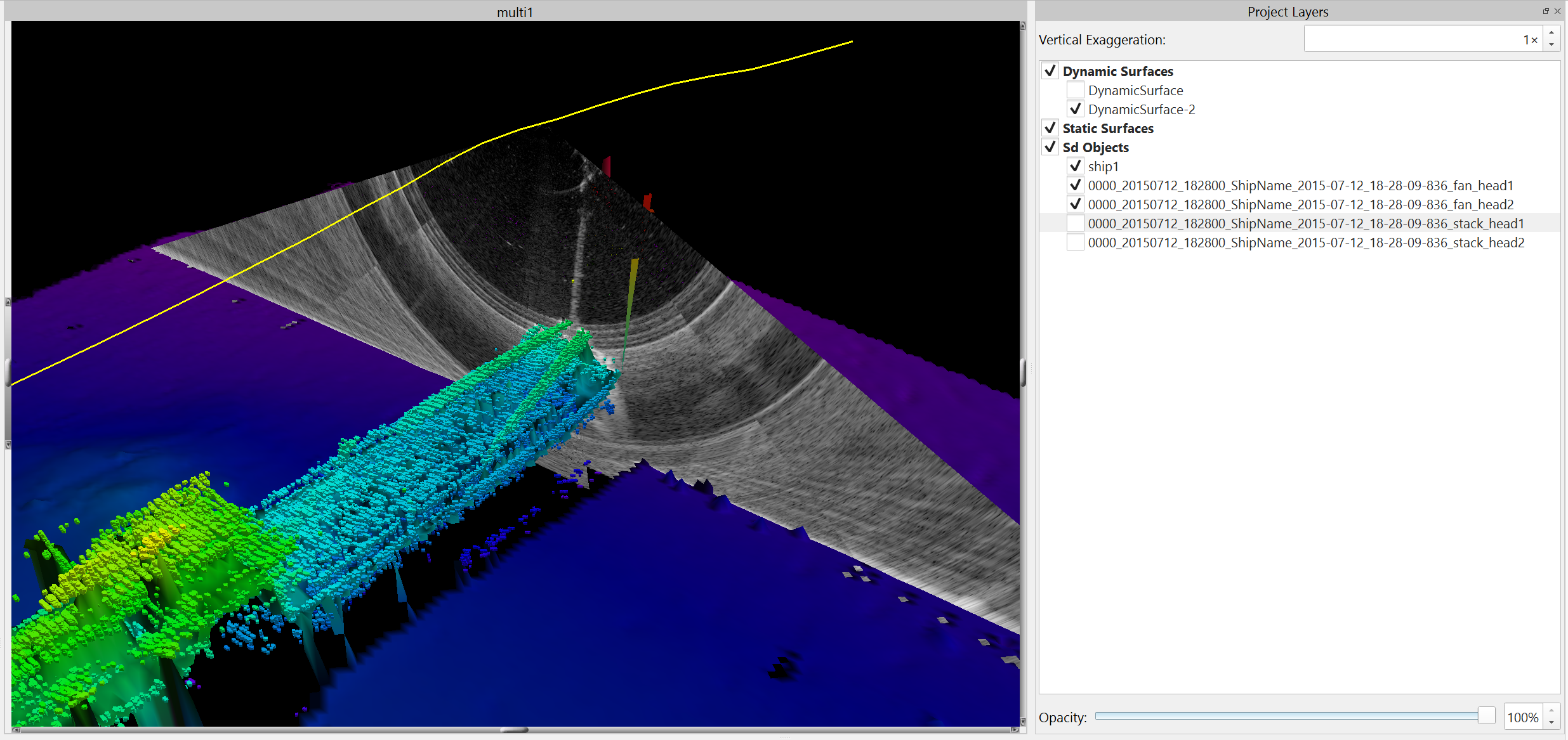 This option will show a depth stack in the Side View. Depth stacking takes the maximum value of each beam at a specific depth. This provides an approximate geo-corrected image as shown below. It is as if the view point is looking through the water column perpendicular to the direction of travel.