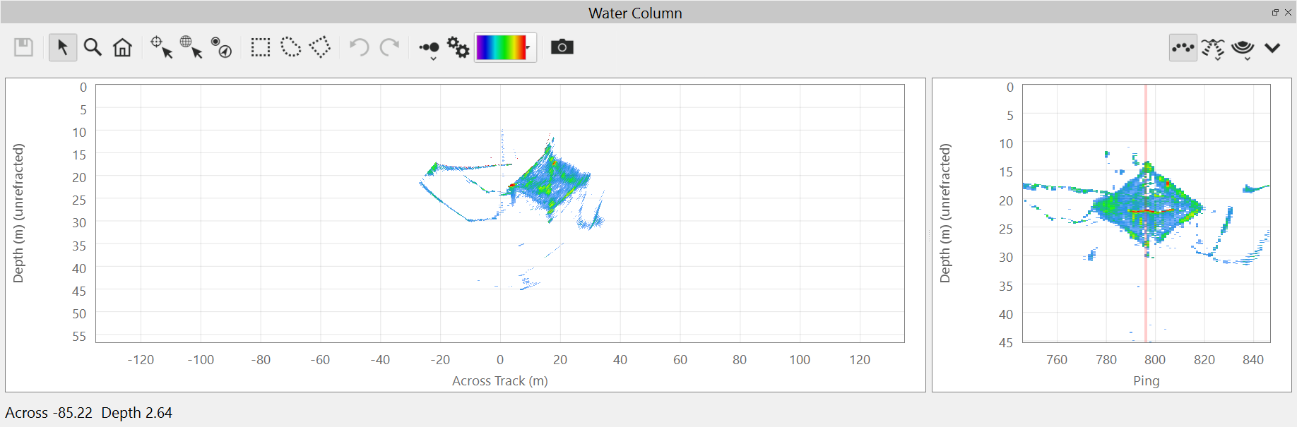 Below is an example using the settings shown in the dialog above. The Fan is in Stack mode and we are left with 2 views of the water column contacts that can be easily selected as additional soundings in either view.