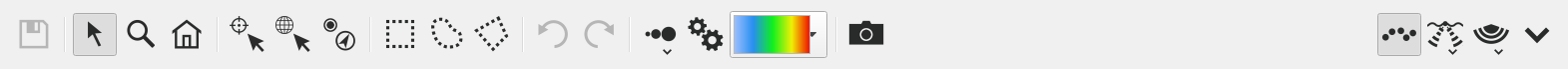 This button can cycle options by clicking or if you click and hold, a drop down menu appear with the options and their descriptions. The options are Wedge view (depth, across track) and Beam/Sample view. Beam/Sample view is mostly useful for multibeam technicians who are examining water column imagery for telltale artifacts when troubleshooting installations or problematic data sets.