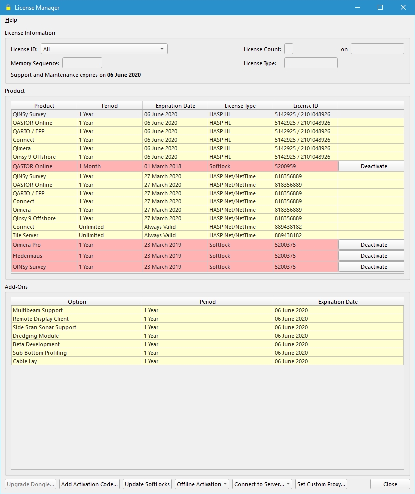 The HASP dongle/softlock license contains a license for the Qinsy software. Several Add-Ons are available. The permission on the dongle allows certain programs to run.
