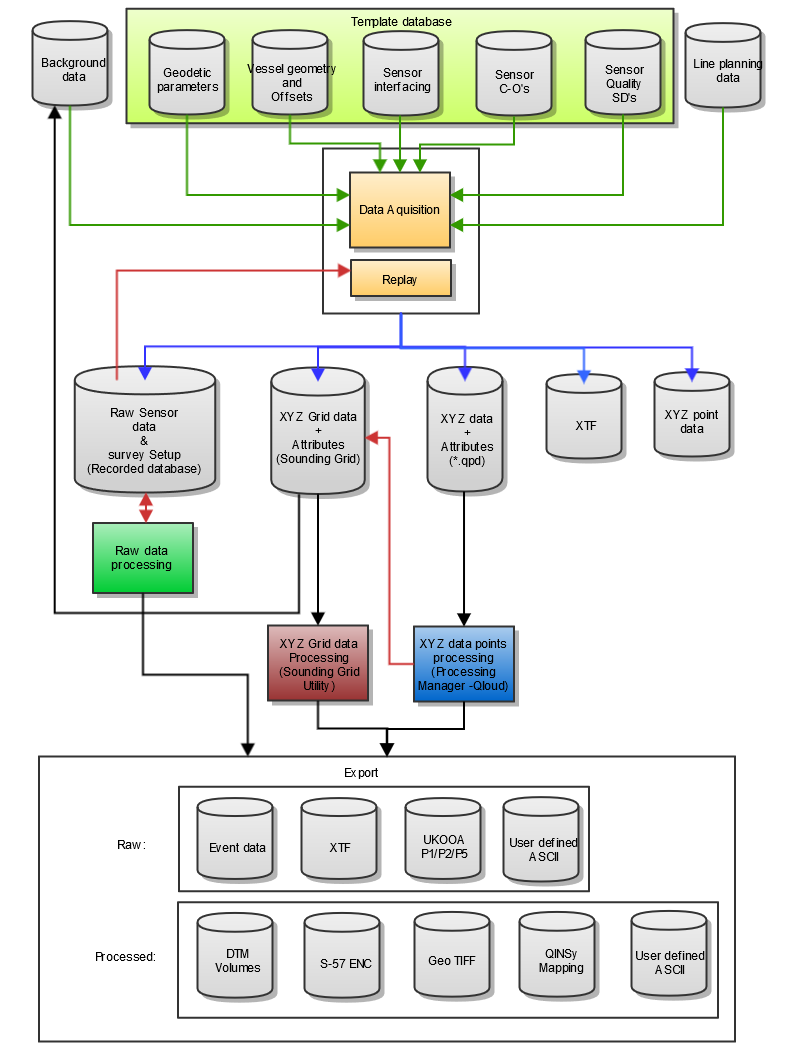 It depends on the type of survey conducted which modules of Qinsy will be used. The data flow scheme below gives an overview of the most extended use of Qinsy: